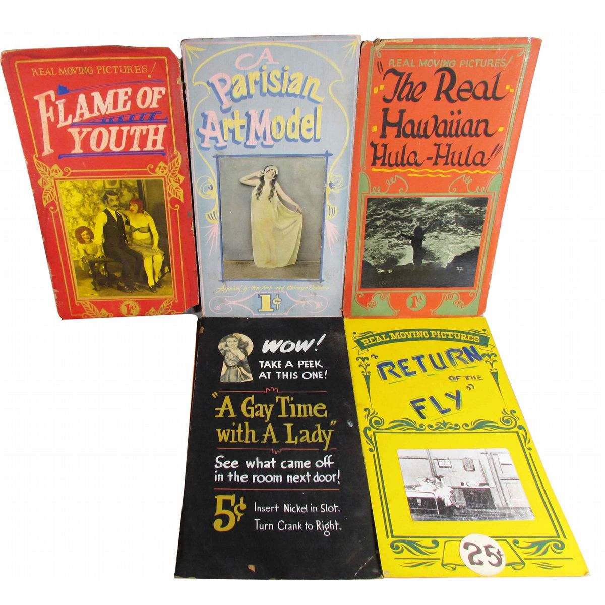 Five Mutoscope Panels. "Return of the Fly", "The Real Hawaiian Hula, Hula", "A Parisian Art Model", "Flame of Youth" and "A Gay Time with a Lady". Various conditions. 10 3/4 X 19 3/4 inches.