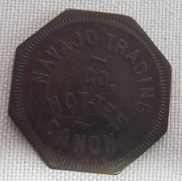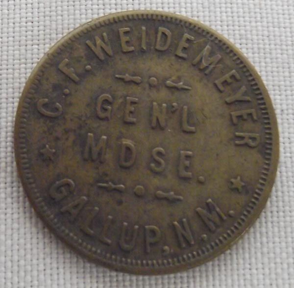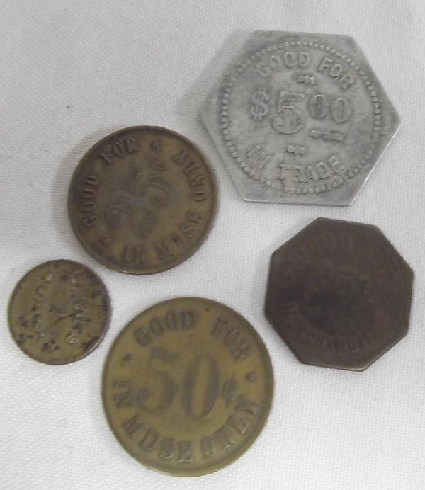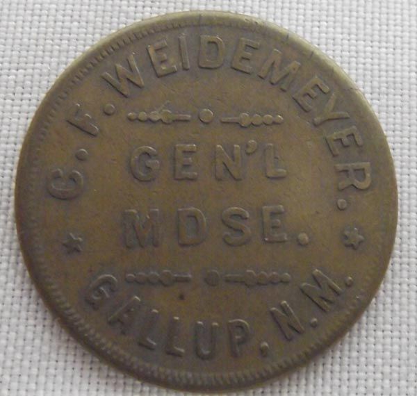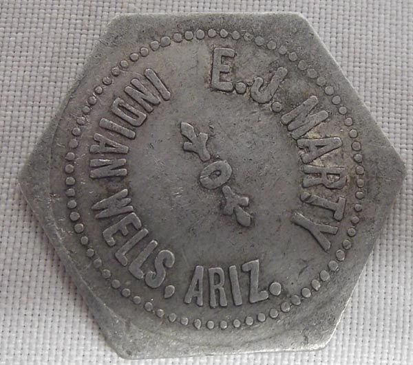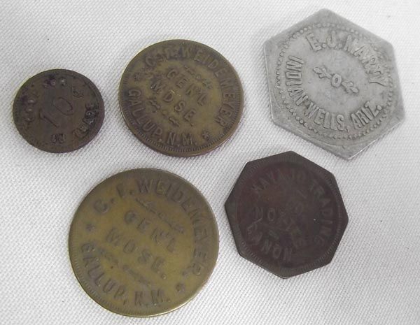 Five Native American Reservation Tokens. Gallup, NM merchandise, Indian Wells, AZ are represented with an information sheet on where these tokens were found in Aug.1960.
