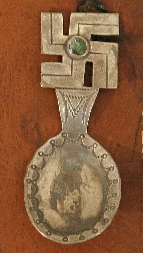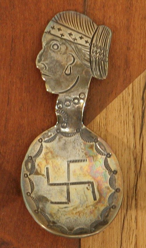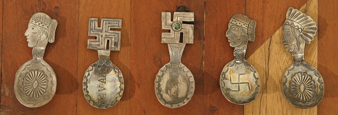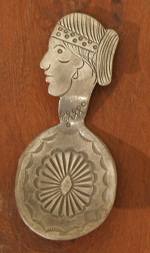 Five Navajo Silver Tea Caddy Spoons. 3 ½" - 4" hand wrought spoons. Two of Indian maidens in profile, one Indian Chief in profile, two whirling logs - one with a center turquoise cabochon & the other stamped NAVAJO in the bowl. Circa 1920-40s. (est. $800-1,200). CONDITION REPORTS: www.auctioninsantafe.com/docs/cr2012.pdf