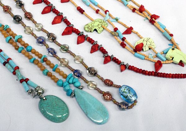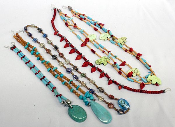 Five Necklaces Designed by Kills Thunder. Magnasite, Turquoise, Pink River Stone, Heishi, Silver Findings. A beautiful variety for any occasion. Longest measures 24''.