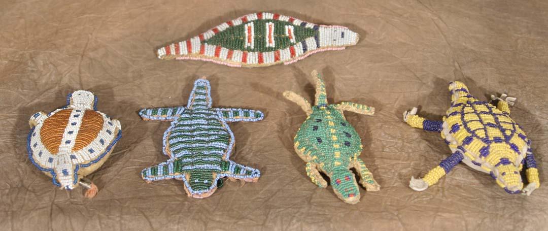 Five Northern Plains Fetishes. All approx. 6" long. Lizards & turtles. An instant collection!. 19th century. (est $2,500-3,500). Provenance: Ex-Rielich Collection. . Additional info: Yellow fetish is marked "Oct 7, 1948, Rielich. (Collection date). . For condition reports please visit: www.auctioninsantafe.com/cr2011.pdf