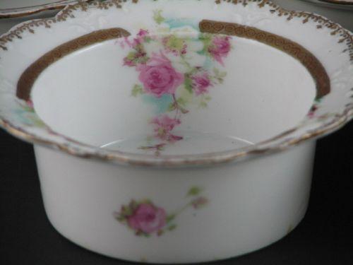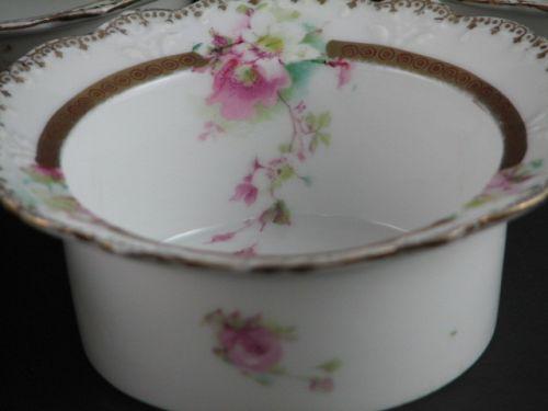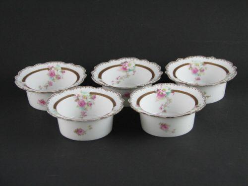 Ca. 1898-1918. Five porcelain ramekins. Features floral and gold transfer design. Marked: "O.& E.G. Royal Austria". Oscar & Edgar Gutherz MFS. Altrohlau, Bohemia. Condition: surface wear to gild on rim. Dimensions: 1.5"H x 4.5"D