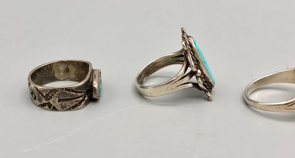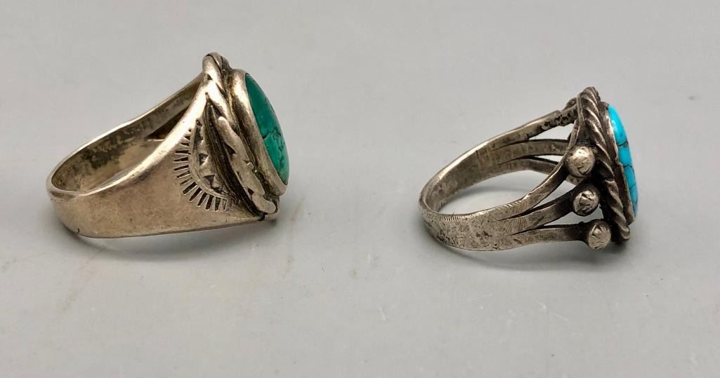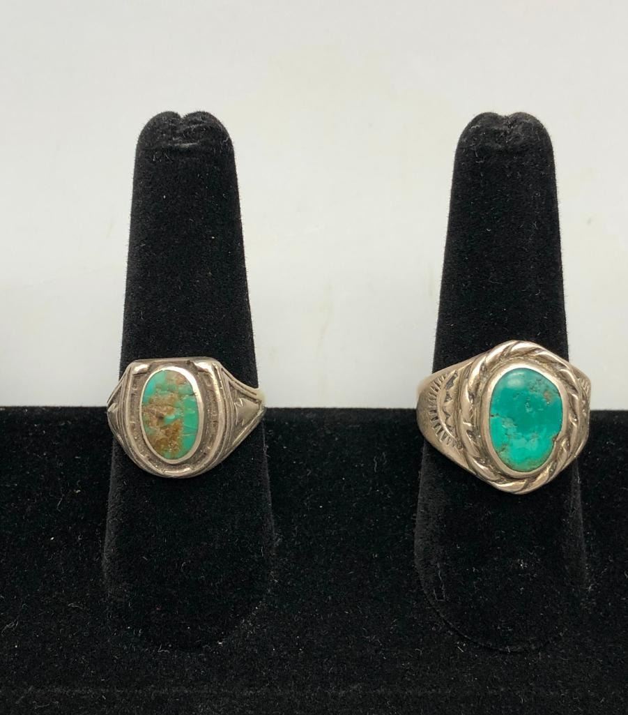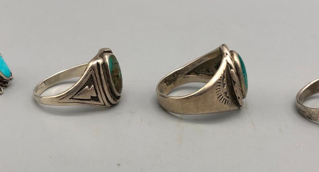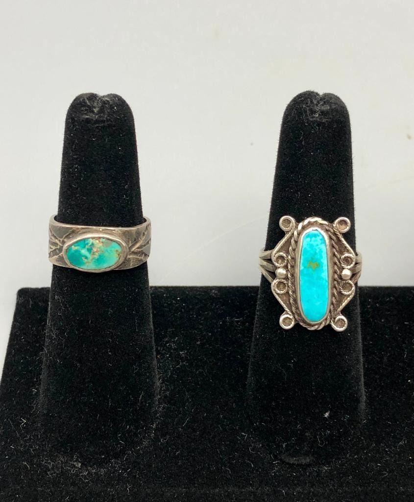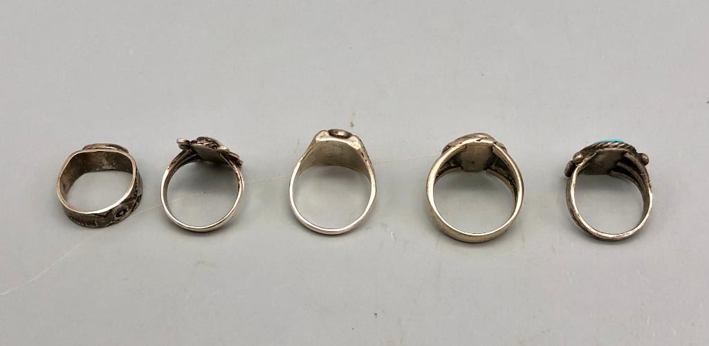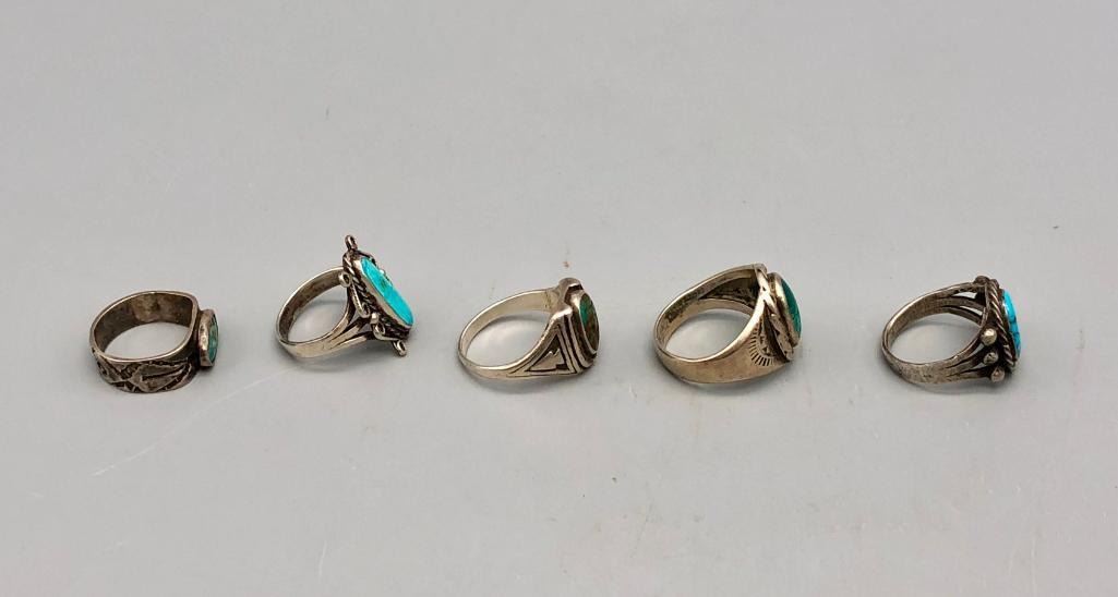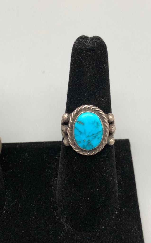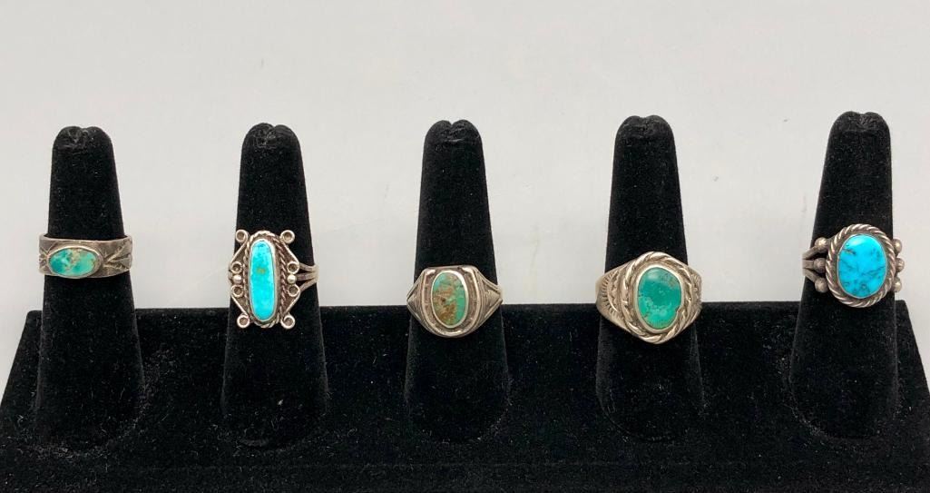 Offered for sale in this lot is a group of five older turquoise rings. All are various sizes and styles. They are set with turquoise stones and are made from sterling silver. MAKER: Various. APPROX AGE: Circa 1950s-1960s. SIZE: Sizes 6.5 - 10. Weighs 33.3 grams. CONDITION: Good for their age, normal wear expected. Please look closely at the pictures as they are an important part of our description and are hereby incorporated into the description, specifically with regards to condition. SHIPPING: There will be a $5 handling / packaging fee for shipping this lot. The actual cost of postage will be added on top of that. BUY IT NOW: If you would like to buy this item now, without waiting for the auction day to bid on it, we do offer this option (which is available up to 48 hours before the actual auction starts). The “Buy it Now†price is the high estimate of this lot (plus applicable fees and the Buyer's premium is discounted to 10% when using the Buy it Now option). If you would like to exercise this option, you must contact us by email (or phone as long as you talk to someone live). Reference this lot number and your intention to "Buy it Now."