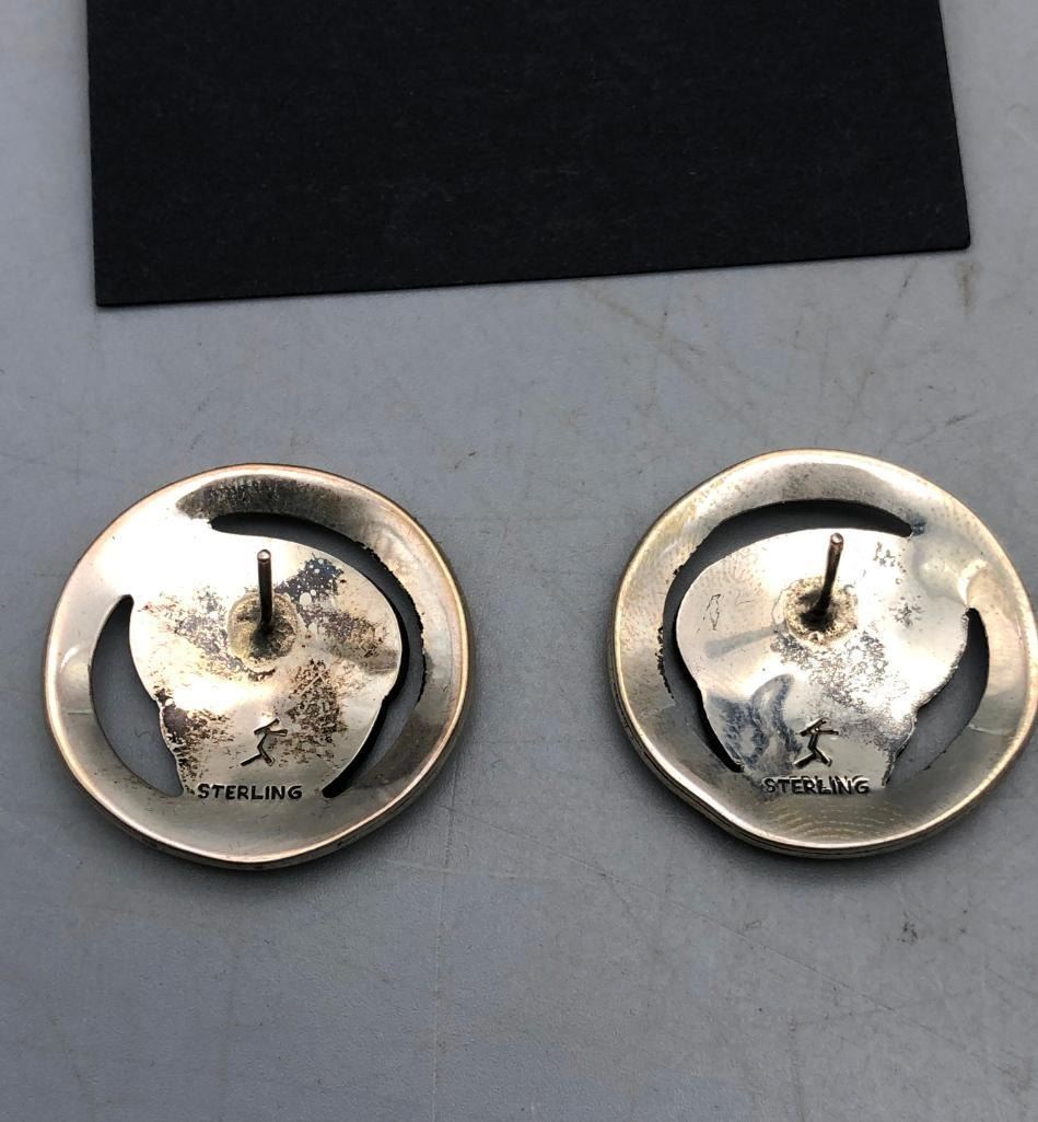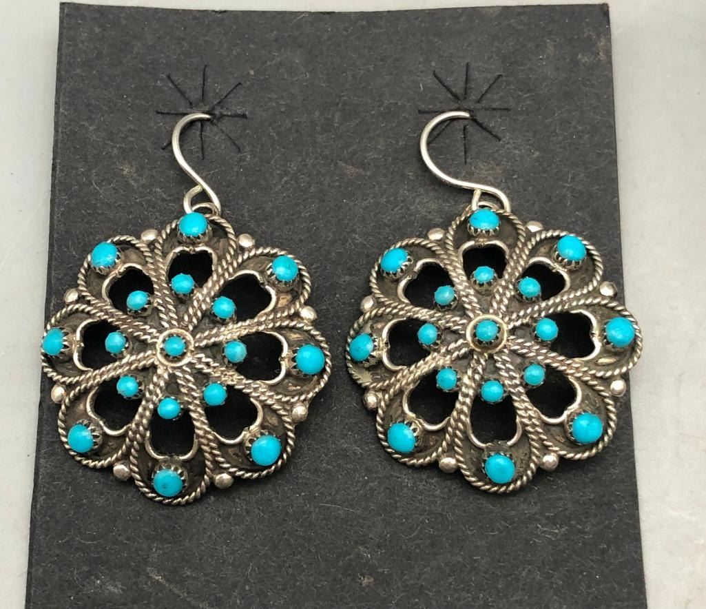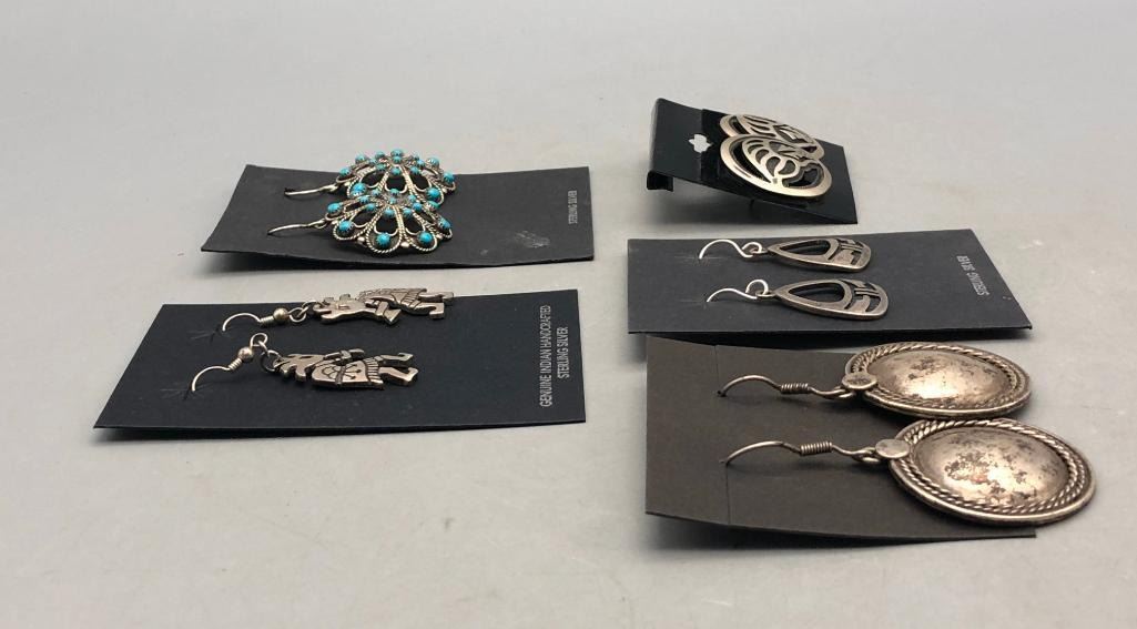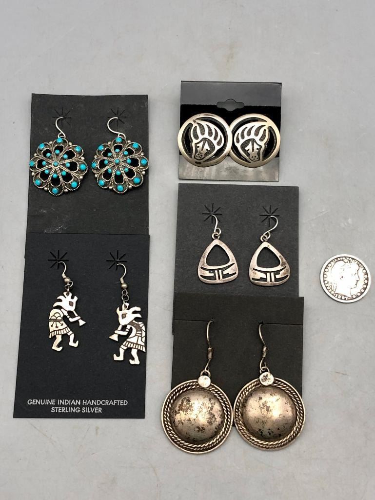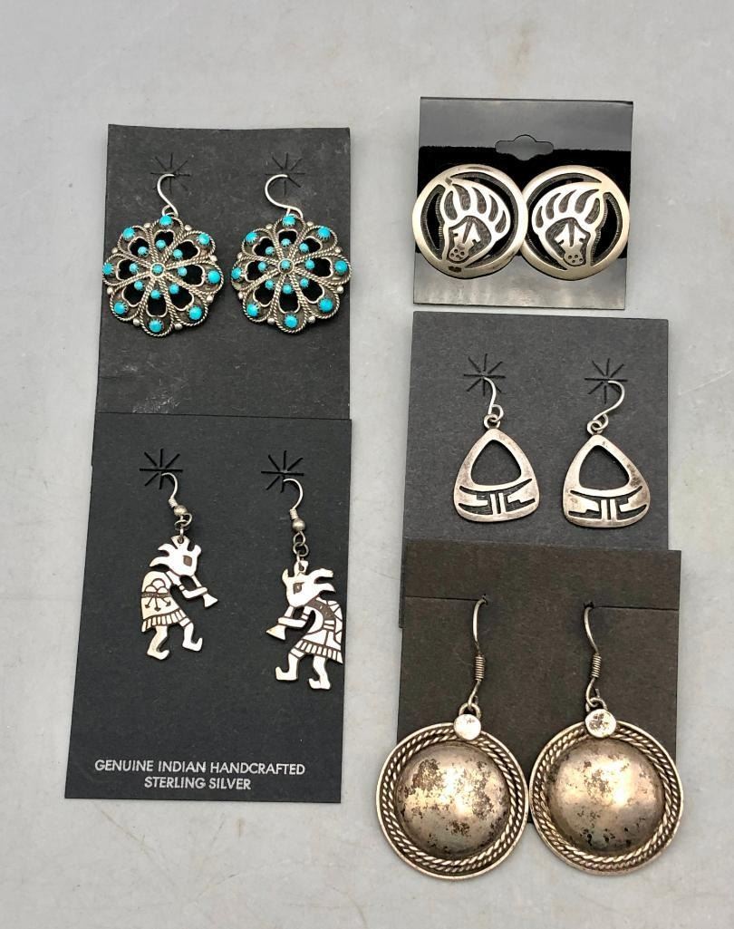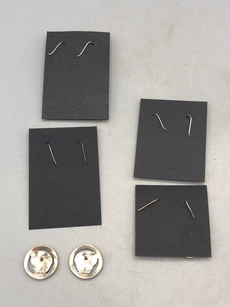 Up for consideration is five pairs of sterling silver earrings. This is a neat lot with different styles of earrings. All are crafted of sterling silver with either overlay designs or set with turquoise stones. Maker: Various. Approx. Age: Vintage. Size: Various. Combined weight is 61.2 grams. Condition: Good for their age, normal wear expected. Please look closely at the pictures - they are an important part of our description. Shipping: There will be a $5 handling / packaging fee for shipping this lot. The actual cost of postage will be added on top of that. BUY IT NOW: If you would like to buy this item now without waiting for the auction to end (this option is only available up to 48 hours before the auction starts to close), the “Buy it Now” price is the high estimate of this lot. If you would like to end the auction early and pay the high estimate (plus applicable fees), please contact us by phone or email and reference this lot number.