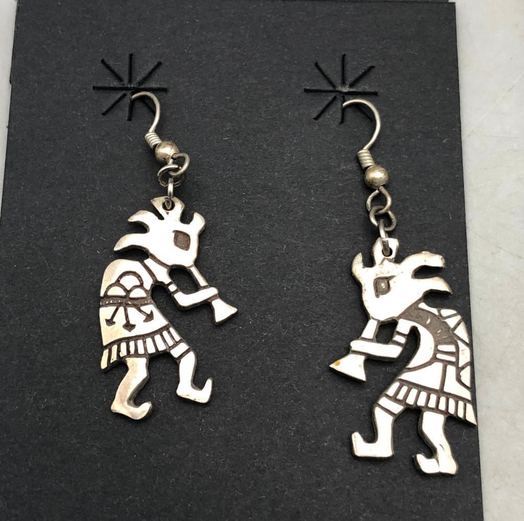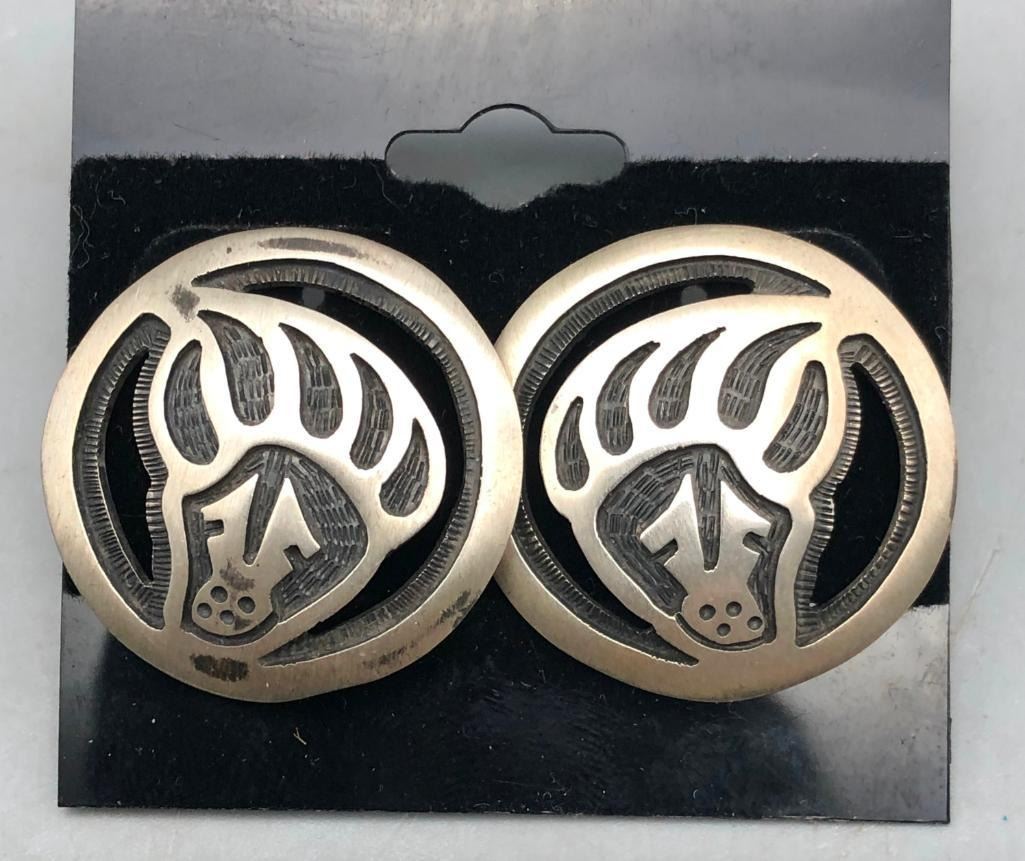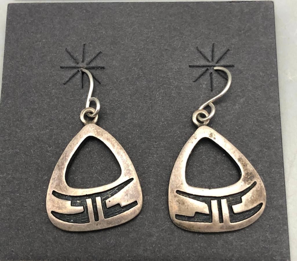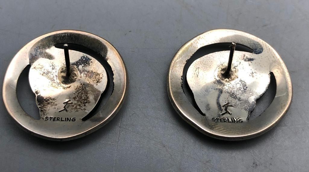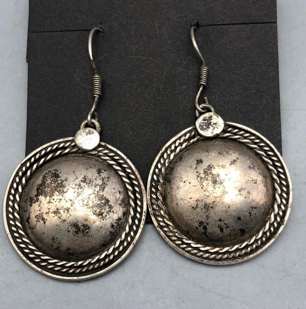 Up for consideration is five pairs of sterling silver earrings. This is a neat lot with different styles of earrings. All are crafted of sterling silver with either overlay designs or set with turquoise stones. Maker: Various. Approx. Age: Vintage. Size: Various. Combined weight is 61.2 grams. Condition: Good for their age, normal wear expected. Please look closely at the pictures - they are an important part of our description. Shipping: There will be a $5 handling / packaging fee for shipping this lot. The actual cost of postage will be added on top of that. BUY IT NOW: If you would like to buy this item now without waiting for the auction to end (this option is only available up to 48 hours before the auction starts to close), the “Buy it Now” price is the high estimate of this lot. If you would like to end the auction early and pay the high estimate (plus applicable fees), please contact us by phone or email and reference this lot number.