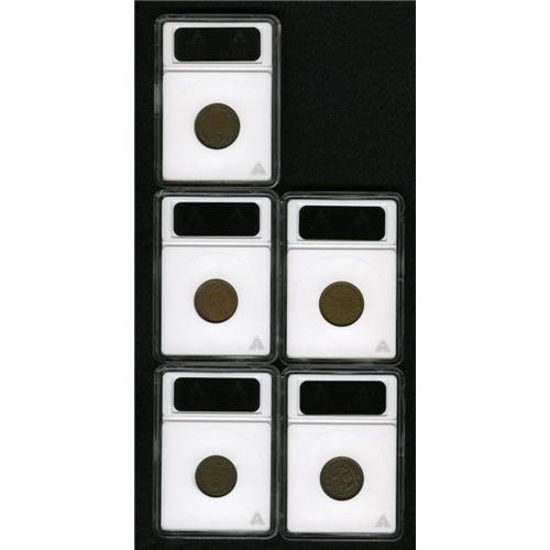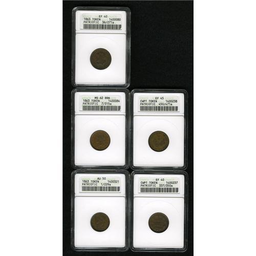 <B>1863 Our Country XF45 ANACS,</B></I> Fuld-1/229a, R.1, suitably struck, a chocolate-brown example with much luster; <B>1863 Army & Navy MS62 Brown ANACS,</B></I> Fuld-7/315a, R.2, a beautiful light tan-gold piece; <B>1863 No Slavery/Union For Ever XF40 ANACS,</B></I> Fuld-36/271a, R.3, nicely detailed, medium brown, struck from worn dies; <B>Undated Our Navy/Flags and Cannon XF40 ANACS,</B></I> Fuld-337/350a, R.2, a moderately circulated but attractive walnut-brown example; and an <B>Undated United We Stand XF45 ANACS,</B></I> Fuld-450/471a, R.1, portions of the obverse highpoints feature close, wispy abrasions.<BR><BR><b>Shipping:</b> Coin/Currency (<a target="_blank" href="http://www.heritageauctions.com/common/shipping.php">view shipping information</a>)