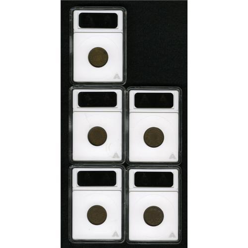 <B>1863 I.O.U. 1 Cent XF40 ANACS,</B></I> Fuld-1/391a, R.1, streaky walnut-brown, a rusted reverse die; <B>1864 Union For Ever AU58 ANACS,</B></I> Fuld-51/342a, R.1, crisply struck aside from the date; <B>1863 Not One Cent Fine 12 ANACS,</B></I> Fuld-66/370a, R.2, typically struck, a few marks on CENT; <B>1863 Wilson's Medal XF45 ANACS,</B></I> Fuld-112/396a, R.1, the centers are soft while the borders are relatively sharp; and an <B>Undated Benjamin Franklin XF40 ANACS,</B></I> Fuld-151/430a, R.1, SAVED is incompletely brought up, struck from rusted dies.<BR><BR><b>Shipping:</b> Coin/Currency (<a target="_blank" href="http://www.heritageauctions.com/common/shipping.php">view shipping information</a>)