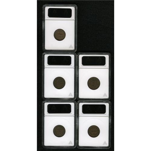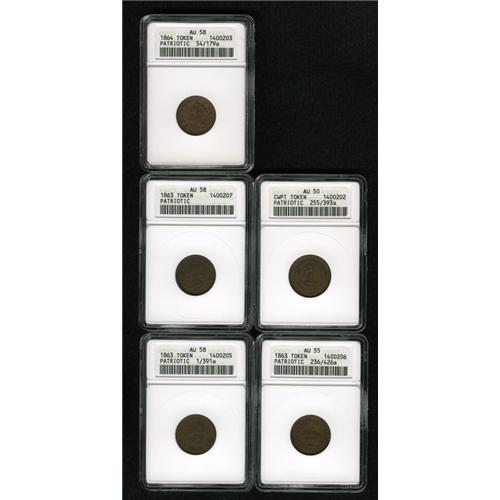 <B>1863 IOU 1 Cent AU58 ANACS,</B></I> Fuld-1/391a, R.1, a few right side specks, slightly off center toward 3 o'clock; <B>1863 Army & Navy AU58 ANACS,</B></I> Fuld-23/306a, R.1, problem-free, a rusted obverse die; <B>1864 Federal Union AU58 ANACS,</B></I> Fuld-54/179a, R.2, a lovely chocolate-brown slider; <B>1863 Liberty/Union AU55 ANACS,</B></I> Fuld-236/426a, R.1, golden-brown, minor verdigris; and an <B>Undated Knickerbocker Currency AU50 ANACS,</B></I> Fuld-255/393a, R.1, moderate aqua-gray build-up.<BR><BR><b>Shipping:</b> Coin/Currency (<a target="_blank" href="http://www.heritageauctions.com/common/shipping.php">view shipping information</a>)
