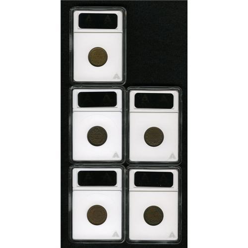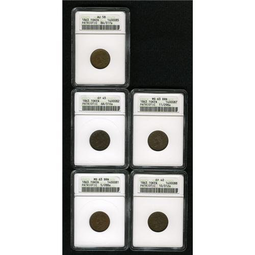 <B>1863 God Protect the Union MS63 Brown ANACS,</B></I> Fuld-5/288a, R.2, a satiny golden-brown token, only trivial carbon; <B>1863 Army & Navy XF45 ANACS,</B></I> Fuld-6B/310a, rose-tinted brown, a mark on the reverse rim at 10:30; <B>1863 Army & Navy AU58 ANACS,</B></I> Fuld-8A/317a, R.1, an attractive golden-brown piece, struck from rusted dies; <B>1863 Army & Navy XF40 ANACS,</B></I> Fuld-10/312a, R.1, build-up in protected areas; <B>1863 Army & Navy MS63 Brown ANACS,</B></I> Fuld-11/298a, R.1, shimmering luster, a smooth chocolate-brown piece. All examples display a Liberty Head similar to that seen on the Confederate cent.<BR><BR><b>Shipping:</b> Coin/Currency (<a target="_blank" href="http://www.heritageauctions.com/common/shipping.php">view shipping information</a>)