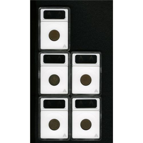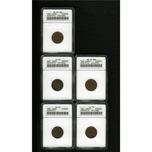 <B>1863 Indian Head/Not One Cent AU50 ANACS,</B></I> Fuld-68A/371a, sharply defined, medium brown toning; <B>Undated Andrew Jackson VF30 ANACS,</B></I> Fuld-137/395a, minor peripheral verdigris; <B>1863 Liberty/Union MS62 Brown ANACS,</B></I> Fuld-236/426a, smooth and satiny, chocolate-brown; <B>1864 Monitor/Our Navy AU58 ANACS,</B></I> Fuld-241/338a, a whisper of reverse carbon; <B>1863 Remembrance/One Country MS63 Brown ANACS,</B></I> Fuld-244/291a, smooth golden-brown surfaces, clashed dies.<BR><BR><b>Shipping:</b> Coin/Currency (<a target="_blank" href="http://www.heritageauctions.com/common/shipping.php">view shipping information</a>)