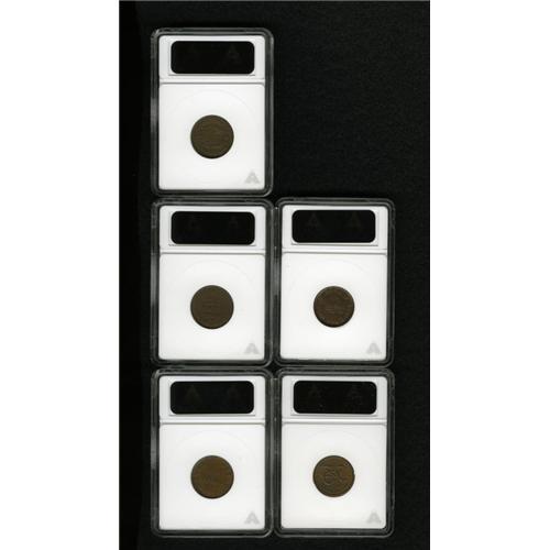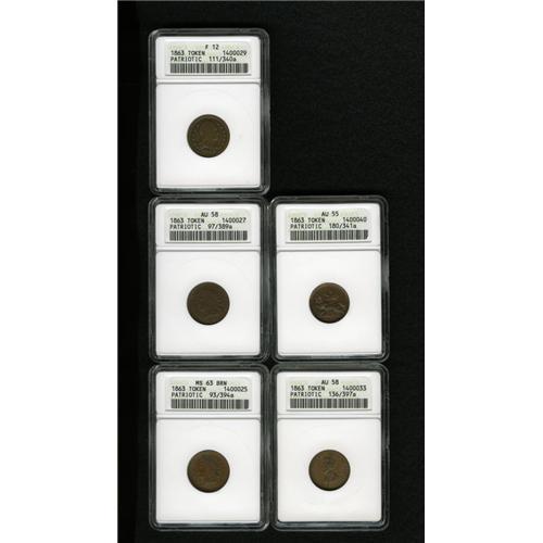 <B>1863 Indian Head/McClellan Medal MS63 Brown ANACS,</B></I> Fuld-93/394a, R.3, well struck aside from the base of the date, smooth, minor build-up; <B>1863 Fort Lafaye/Not One Cent AU58 ANACS,</B></I> Fuld-97/389a, R.2, golden-brown, the reverse field is mildly matte-like; <B>1863 Washington/Union Shield Fine 12 ANACS,</B></I> Fuld-111/340a, R.3, even wear, a couple of minor spots, rotated dies; <B>1863 Jackson/Snake AU58 ANACS,</B></I> Fuld-136/397a, R.1, attractive for the grade, a minor curved clip (as made) at 7 o'clock; and an <B>1863 Horseman with Sword/Union For Ever AU55 ANACS,</B></I> Fuld-180/341a, R.1, substantial satin luster, orange-peel texture from worn dies.<BR><BR><b>Shipping:</b> Coin/Currency (<a target="_blank" href="http://www.heritageauctions.com/common/shipping.php">view shipping information</a>)