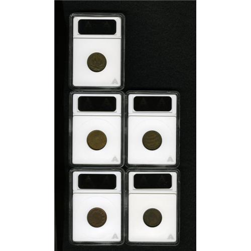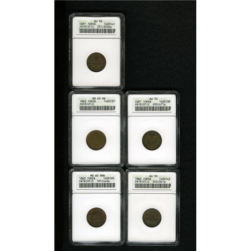 <B>1863 Pro Bono Publico/New York MS60 Brown ANACS,</B></I> Fuld-191/443a, R.2, mostly deep brown, but the borders display pumpkin-gold; <B>1863 Flag of Our Union MS63 Red and Brown ANACS,</B></I> Fuld-207/409a, R.1, orange-gold borders frame gunmetal-gray centers; <B>Undated Our Country AU58 ANACS,</B></I> Fuld-231/352Aa, R.1, attractive chocolate-brown surfaces; <B>1863 Monitor/Union For Ever AU50 ANACS,</B></I> Fuld-240/341a, R.1, worn dies but otherwise problem-free for the grade; and an <B>Undated United We Stand AU53 ANACS,</B></I> Fuld-450/417a, R.2, minor debris in protected areas.<BR><BR><b>Shipping:</b> Coin/Currency (<a target="_blank" href="http://www.heritageauctions.com/common/shipping.php">view shipping information</a>)