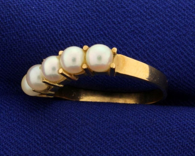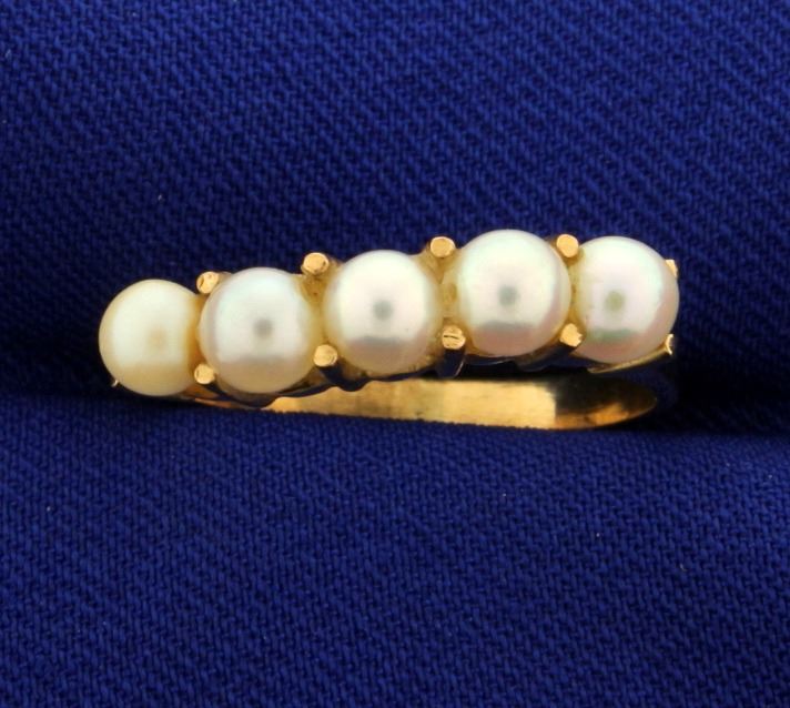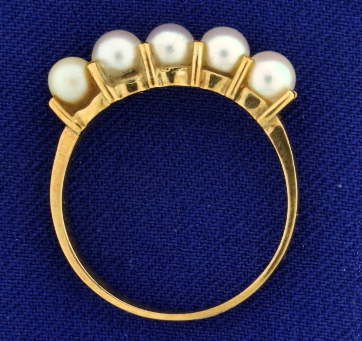 In 14k yellow gold, containing five 4mm pearls with excellent color and luster. Size 8 1/2. 3.1g.