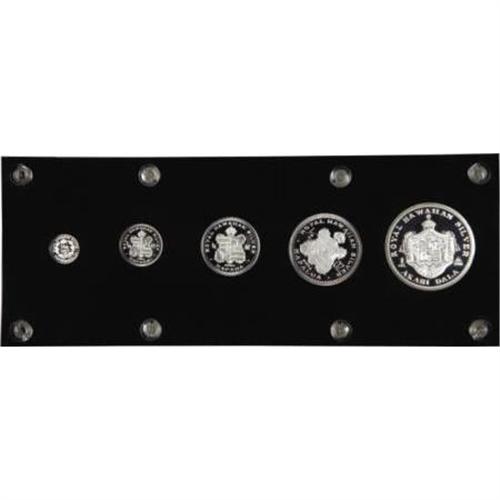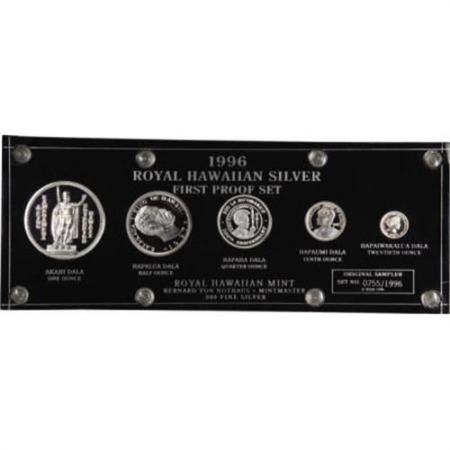 <B>Five-Piece 1996 Royal Hawaiian Silver Proof Set.</B></I> Silver, 1996 five-piece proof set issued in .999 fine silver by the Royal Hawaiian Mint, Bernard Von Nothaus, Mintmaster. The weights of the pieces range from 1 oz, 1/2 oz, 1/4 oz, 1/10 oz, and 1/20th oz. The entire set is housed in a large black Capital-type plastic holder and serial numbered 0755/1996.<BR><BR><b>Shipping:</b> Coins & Currency (<a target="_blank" href="http://www.heritageauctions.com/common/shipping.php">view shipping information</a>)