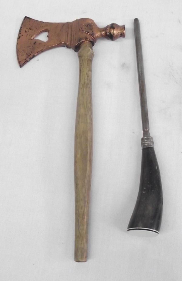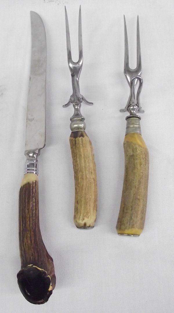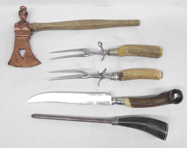 Five-Piece Fancy Handle Cutlery Set plus Tomahawk Pipe. Two forks with antler handles. Knife is stainless steel and the longest at 14.5'', 1.5''W. Sheffield England Royal Brand Cutlery Company. Tomahawk Pipe has a wooden handle.