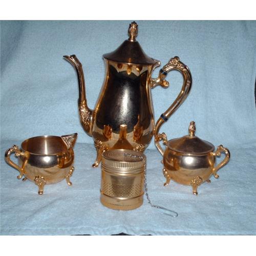 Tea set includes tea server,sugar bowl with lid, creamer,tea ball.The tray is round and can also be used for tea cakes.Gold plated made in Hong Kong.This set is in very good condition and the tea server measures 10 inches tall and the tray measures 12 inches.