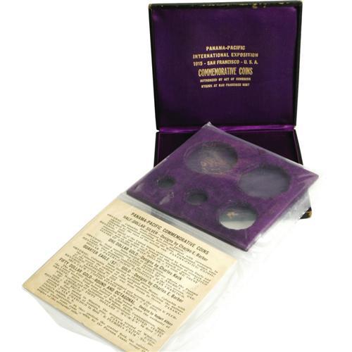 <B>Five-Piece Pan-Pac Commemorative Set Holder, Box & Insert Only.</B></I> Several packaging options were offered for the various coins commemorating the Panama-Pacific Exposition. This five-coin leather case would house the commemorative gold dollar, quarter eagle, half dollar, and has space for both a round and octagonal fifty dollar coin, although buyers could choose to purchase one or both of those coins. The case is lined with purple velvet, imprinted PANAMA-PACIFIC / INTERNATIONAL EXPOSITION / 1915 -- SAN FRANCISCO -- U.S.A. / COMMEMORATIVE COINS / AUTHORIZED BY ACT OF CONGRESS / STRUCK AT SAN FRANCISCO MINT. An inner purple-velvet cardboard insert houses the coins, with a separate cardboard insert giving the design details and mintage limits. The hinged outer case is in Fine condition, with some light crazing and rubbing on the corners and edges. The inner pieces are expectedly in better shape, but the cardboard shows the expected yellowing.<BR><BR><b>Shipping:</b> Coin/Currency (<a target="_blank" href="http://www.heritageauctions.com/common/shipping.php">view shipping information</a>)