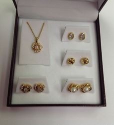 Five Piece Set containing 18" Necklace with matching earring as well as Three Pairs of Earrings All Gold Electroplated with Cubic Zirconia and Lead-Free Glass Pearl