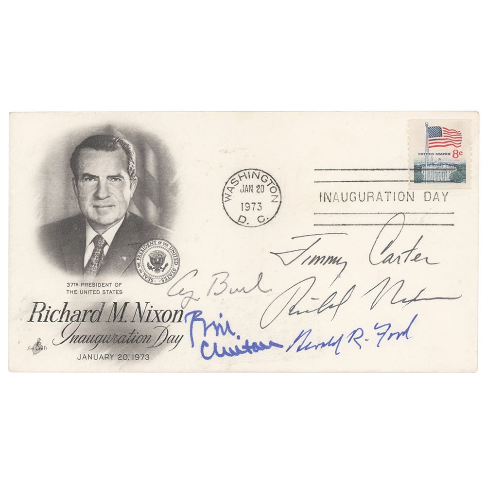 Fantastic commemorative cover honoring Richard Nixon's second inauguration day, signed in felt tip by Richard Nixon, Gerald R. Ford, Jimmy Carter, George Bush, and Bill Clinton. In fine condition. A scarce assemblage of five presidents on a desirable philatelic format.