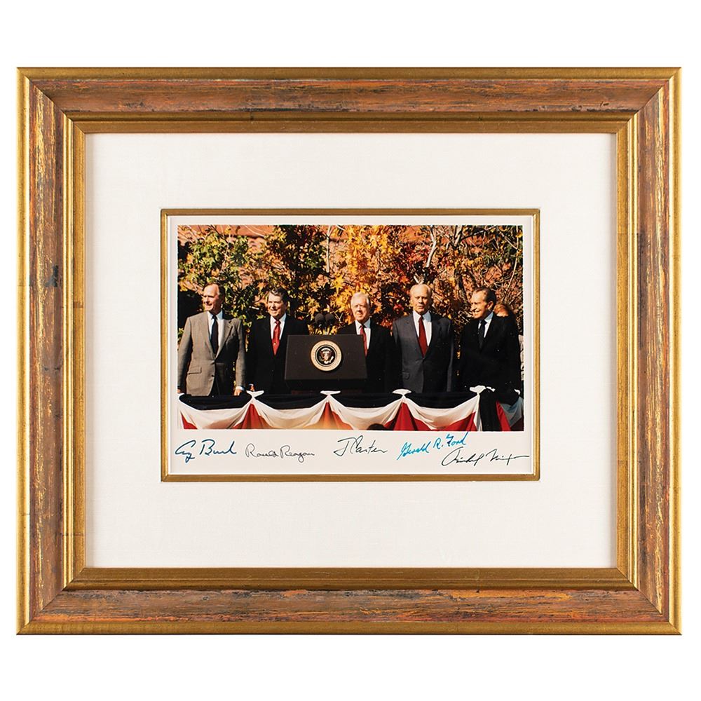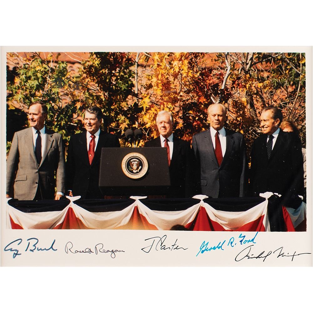 Sought-after color satin-finish 9.75 x 7 photo of five American presidents posing together during the opening ceremony of the Ronald Reagan Presidential Library in Simi Valley on November 4, 1991, signed in the lower border in black felt tip, "George Bush," "Ronald Reagan," “J. Carter," and “Richard Nixon,†and in blue ink, "Gerald R. Ford." Handsomely cloth-matted and framed to an overall size of 17.75 x 15.25. In very fine condition.