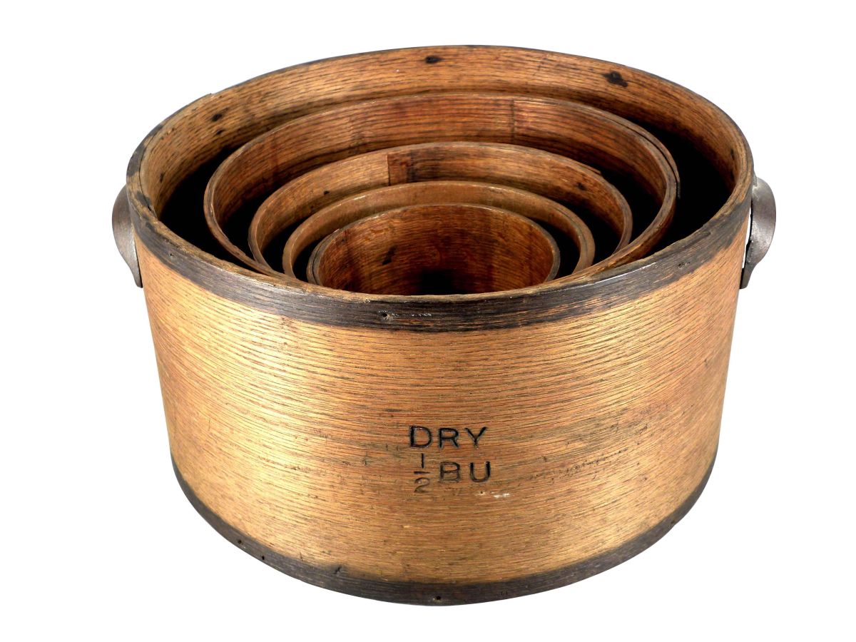 Set of Five Primitive Country Store Nesting Oak Storage Containers, made by E.B. Frye & Son, Wilton, NH. Large on has handles. Various sizes, 1,2,4 and 8 quart and 1/2 bushel dry. Excellent original condition.