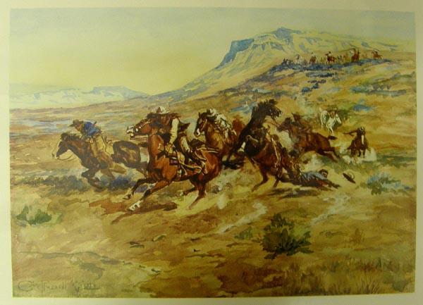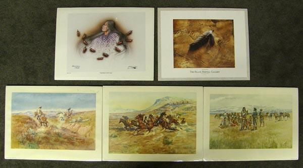 Five Prints: 3 by CM Russell, 1 Signed and Numbered Print by Kiowa Artist Robert Redbird, and 1 by Frank Howell. Largest visual measures approx. 9.75''Hx13.75''W. SHI $30.