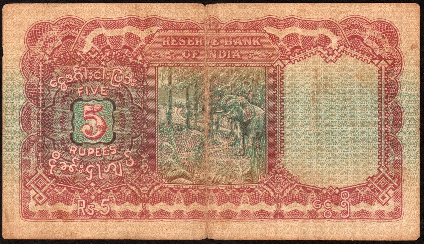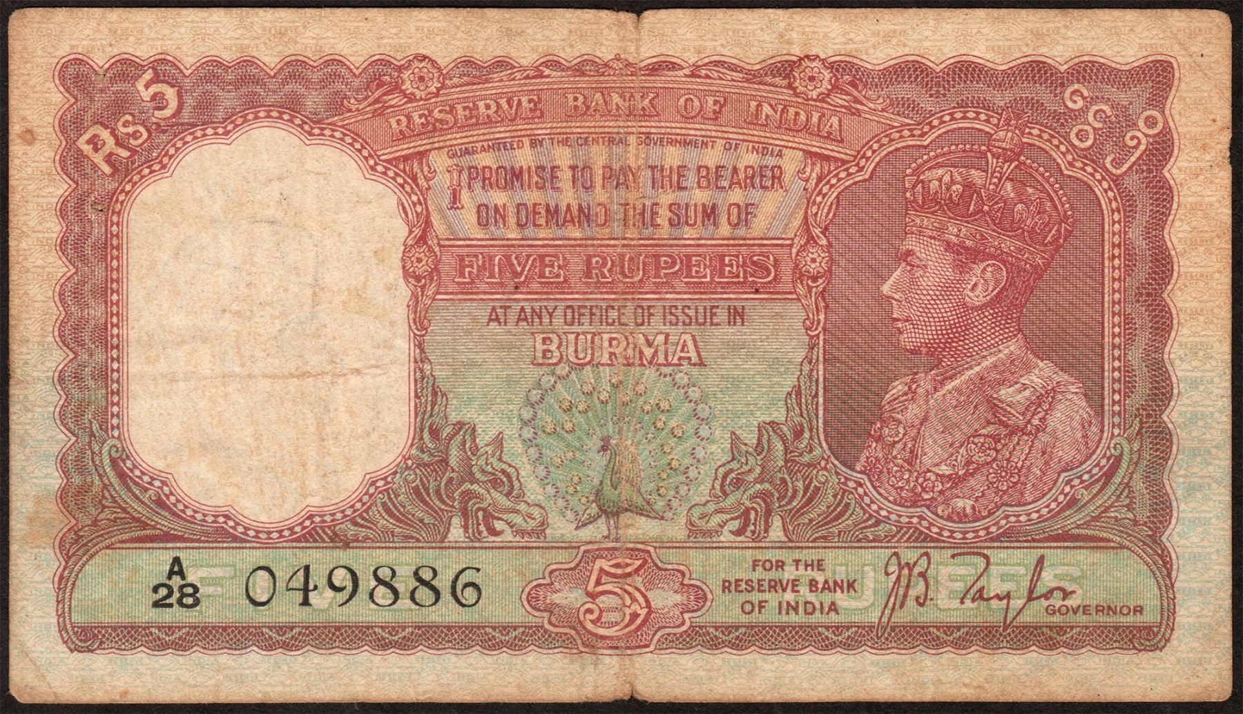 British India, 1938, King George VI, 5 Rupees, Signed by J. B. Taylor, Burma - Peacock Issue, A Prefix, S. No. A28 049886, (KJ & RR # 5.4.1), holes, folds, stains, about very fine.