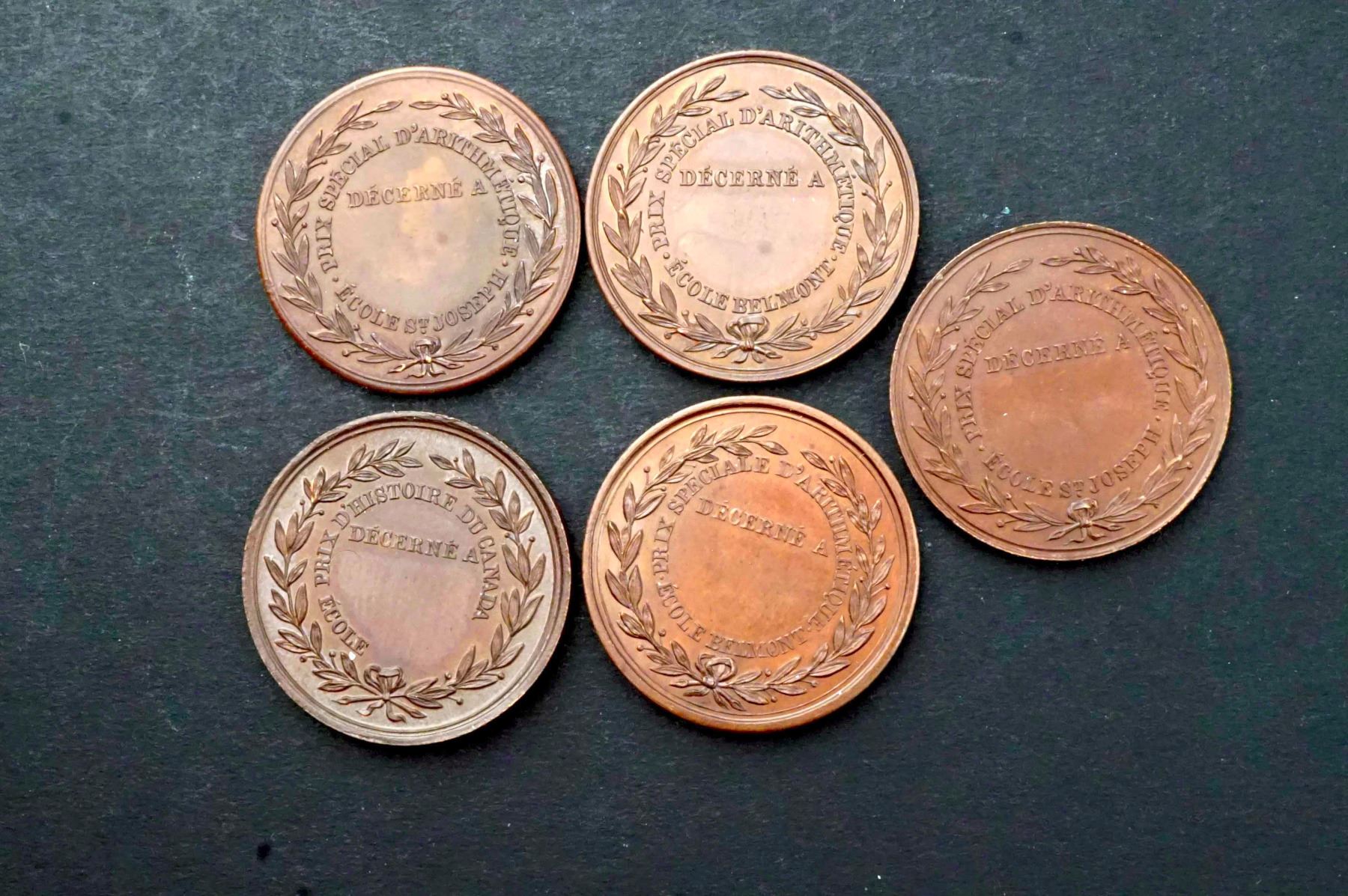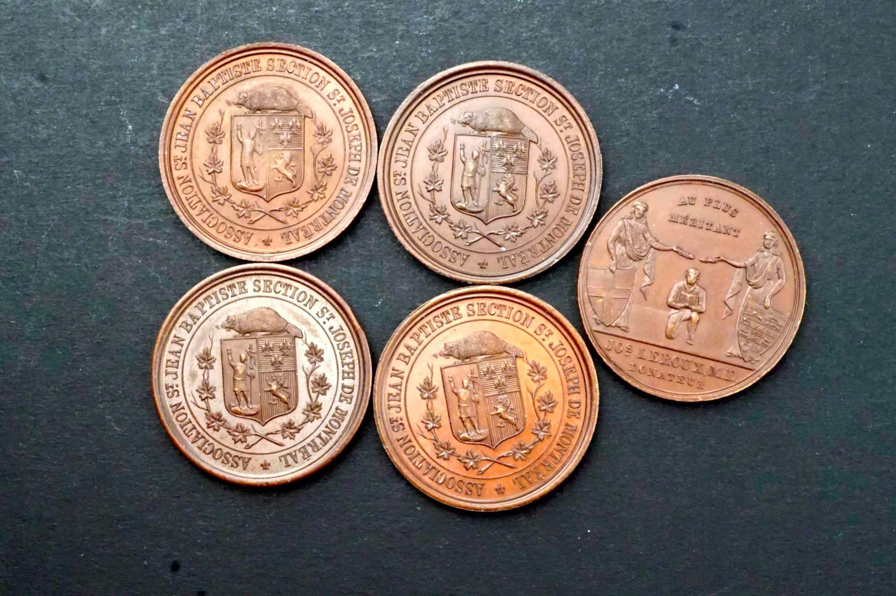 4) and 5) are identical. 1), 3), 4) and 9) have the identical obverse - the SSJB crest, a beaver atop and a wreath of maple leaves, around: ASSOCIATION ST. JEAN BAPTISTE SECTION ST. JOSEPH DE Montréal. Reverse: PRIX SPÉCIALE D'ARITHMÉTIQUE ÉCOLE ST. JOSEPH DÉCERNÉ À AROUND, A WREATH OF LAUREL LEAVES. 3) Has same reverse, only ÉCOLE (blank). 4 & 5) Same reverse, only ÉCOLE BELMONT. 2) has a different. Reverse: Student, holding open book, between two standing female figures with large shields. Above: AU PLUS MÉRITANT. Below: JOS. LEROUX M.D. DONNATEUR, 24mm, c. 5 grams each.