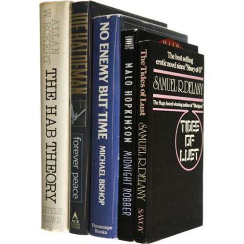 <B>Five Science Fiction Books.</B></I> Includes the following:<BR><B>Nalo Hopkinson Signed:</B></I><B><I> Midnight Rider.</B></I></B></I> (New York: Warner Books, 2000), Advance Reading Copy edition, 329 pages, black wraps with illustrations, 8vo. Condition: very good.<BR><B>Samuel R. Delany Signed:</B></I><B><I> Tides of Lust.</B></I></B></I> (Manchester, England: Savoy, 1980), first paperback UK edition thus, 173 pages, black wraps, 12mo. Condition: very good.<BR><B>Joe Haldeman Signed:</B></I><B><I> Forever Peace.</B></I></B></I> (New York: Ace Science-Fiction Books, 1997), first edition, 326 pages, sage green over black boards, 8vo, dust jacket. Condition (book/ dj): very good/ fine.<BR><B>Michael Bishop:</B></I><B><I> No Enemy But Time.</B></I></B></I> (New York: Timescape, 1982), first edition, 397 pages, purple cloth over blue boards, 8vo, dust jacket. Condition (book/ dj): fine/ good.<BR><B>Allan W. Eckert:</B></I><B><I> The Hab Theory.</B></I></B></I> (Boston: Little, Brown and Co., 1976), first edition, 566 pages, black boards, 8vo, dust jacket. Condition (book/ dj): very good/ good.<BR><BR><BR><b>Shipping:</b> Books & Catalogs (<a target="_blank" href="http://www.heritageauctions.com/common/shipping.php">view shipping information</a>)
