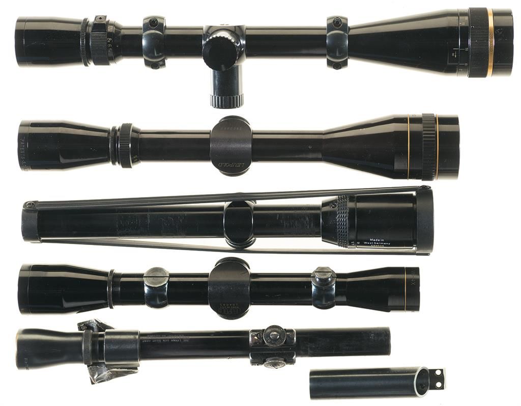 Leupold 6.5x20 scope with rings, Leupold 3x9 scope, Zeiss 4.5x18 scope, Leupold M8-4x scope with rings, Lyman 2 1/2x scope with mounts.