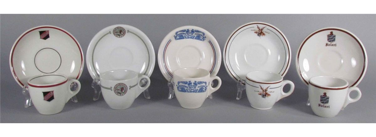 Five Sets of Cups and Saucers Restaurant Ware. The Great Seal of Minnesota, Solari, Thor-Wald, Restaurant Antoine and Minimax. No chips or cracks. Each small cup measures 2 1/2 inch diameter X 2 1/4 inches tall.