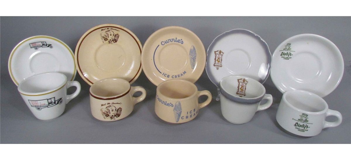 Five Sets of Cups and Saucers Restaurant Ware. Currie's Ice Cream, Aunt Jemima's Kitchen, Mr. Spudnut, Dinty's and Keith's Model-T Truck Stop. No chips or cracks, excellent condition. Each mug approx. measures 3 inch diameter X 3 inches tall.