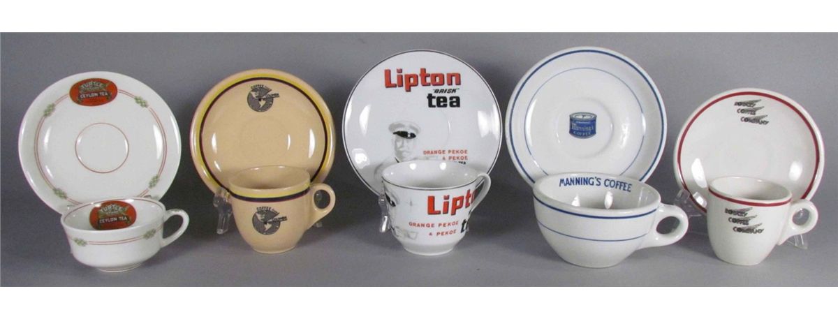 Five Sets of Cups and Saucers with Advertising. Manning Coffee, Rotary Coffee Lipton Tea, Coffee from Columbia and Turtle Brand Ceylon Tea. No chips or cracks. Largest cup measures 4 inch diameter X 2 1/2 inches tall.