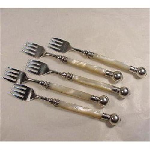 Very attractive little slim forks - maybe for oysters, or pickles or whatever.  Lovely handle made in mother of pearl with silver plated mounts. Nicely detailed with scrolls and ball finials - even the finial has a little top detail with a gold coloured centre.