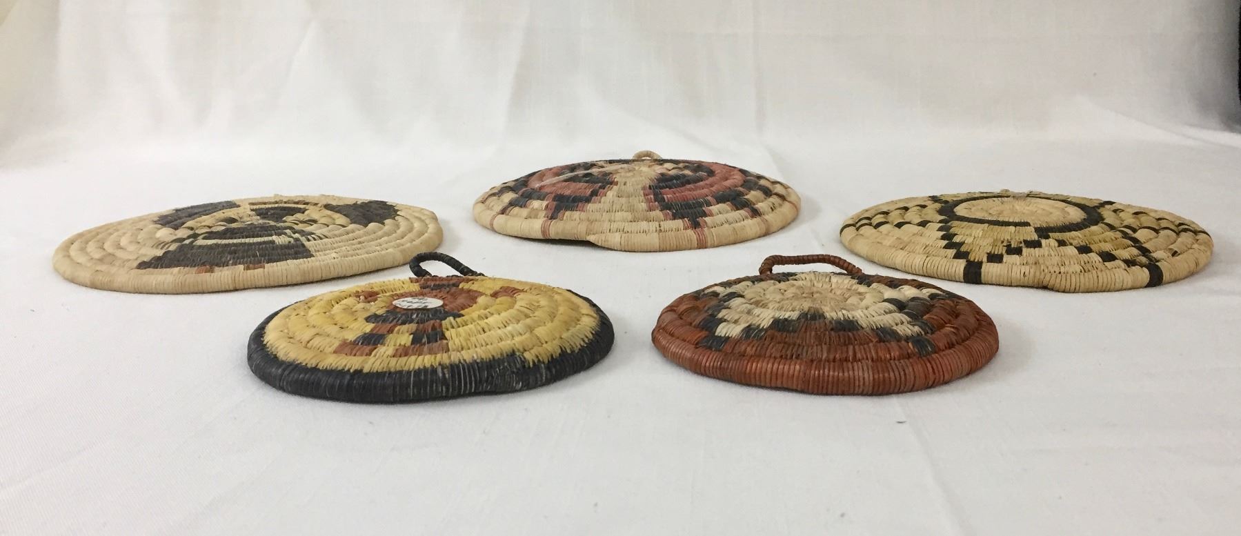 Description: For your collection we offer for sale, five, smaller sized, Hopi coiled baskets featuring various designs. Maker: Unknown Hopi artists. Approx. Age: Vintage. Size: From 7”w x 1” deep to 4-3/4” round x 3/4” deep. Condition: Good for their age, normal wear expected. Please look closely at the pictures - they are an important part of our description. Shipping: There will be a $8 handling / packaging fee for shipping this lot. The actual cost of postage will be added on top of that.