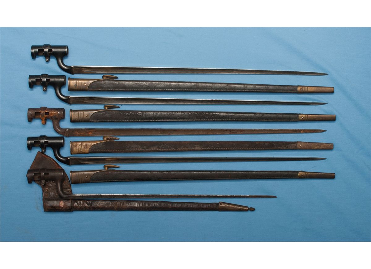 Four bayonets with 23 inch blades and one with an 18 ich blade. All with leather scabbards. CONDITION: Fair or better overall.
