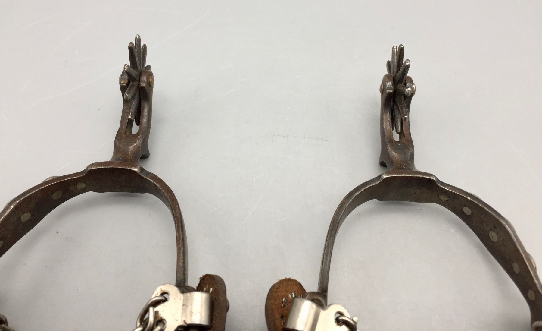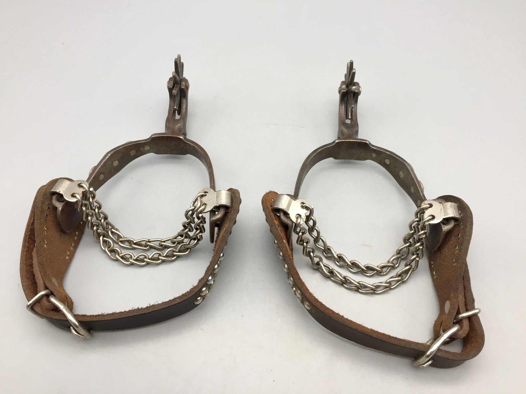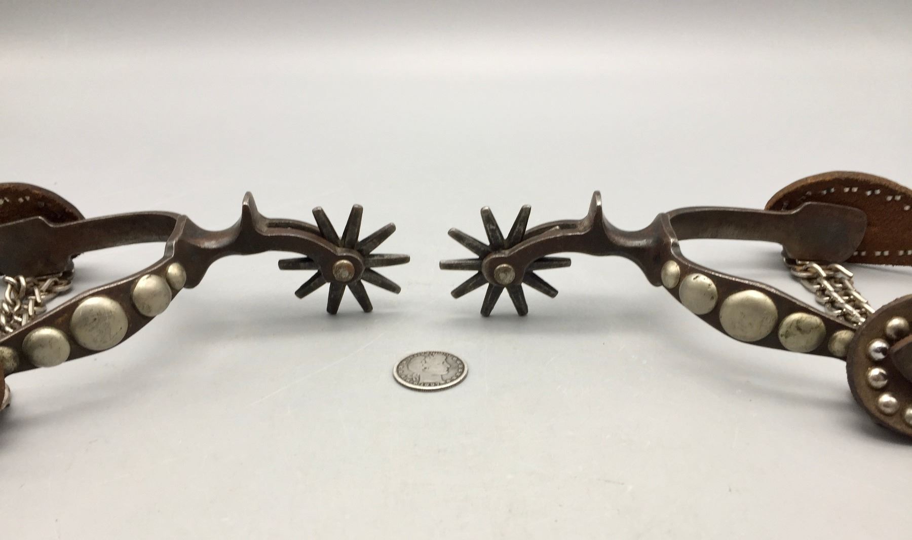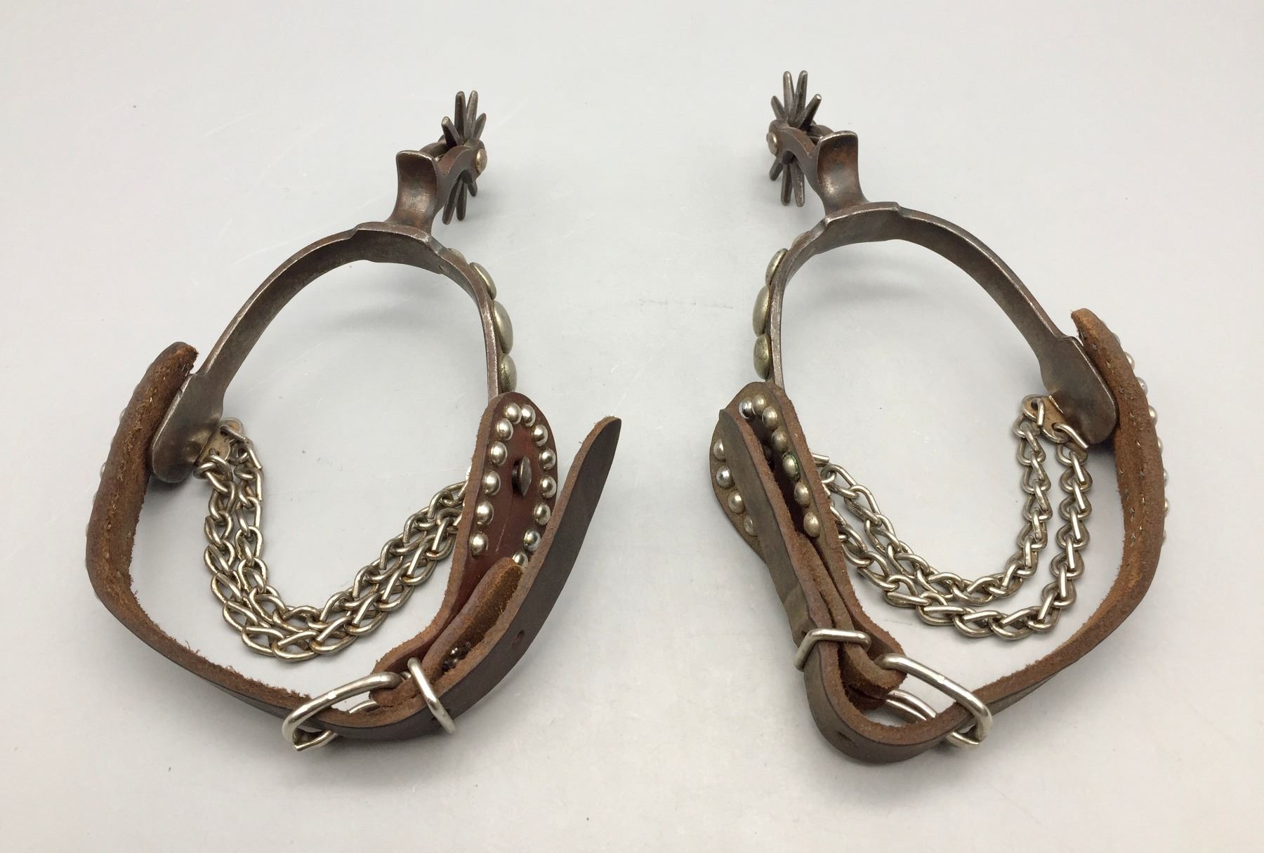 Description: Presented for sale in this lot is a pair of five spot Buermann style spurs with brown leather straps with silver button accents.