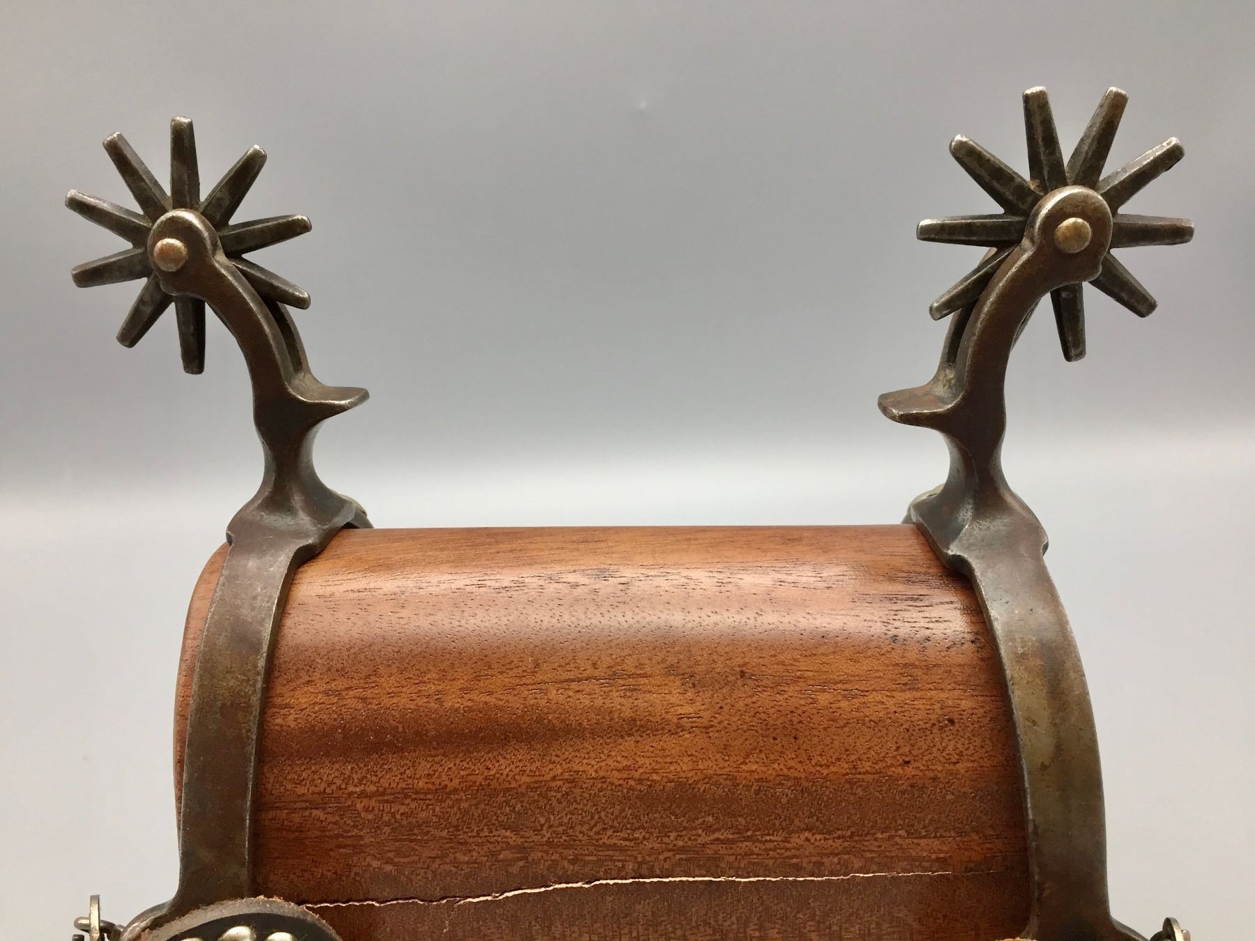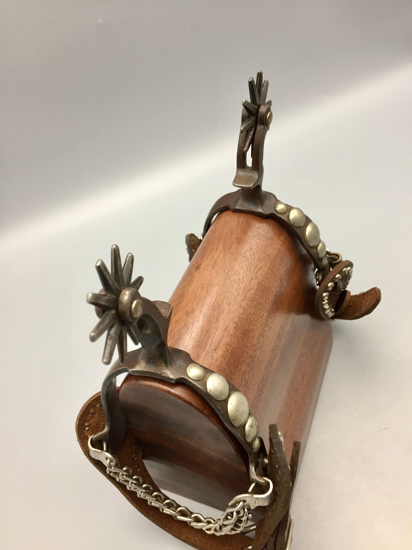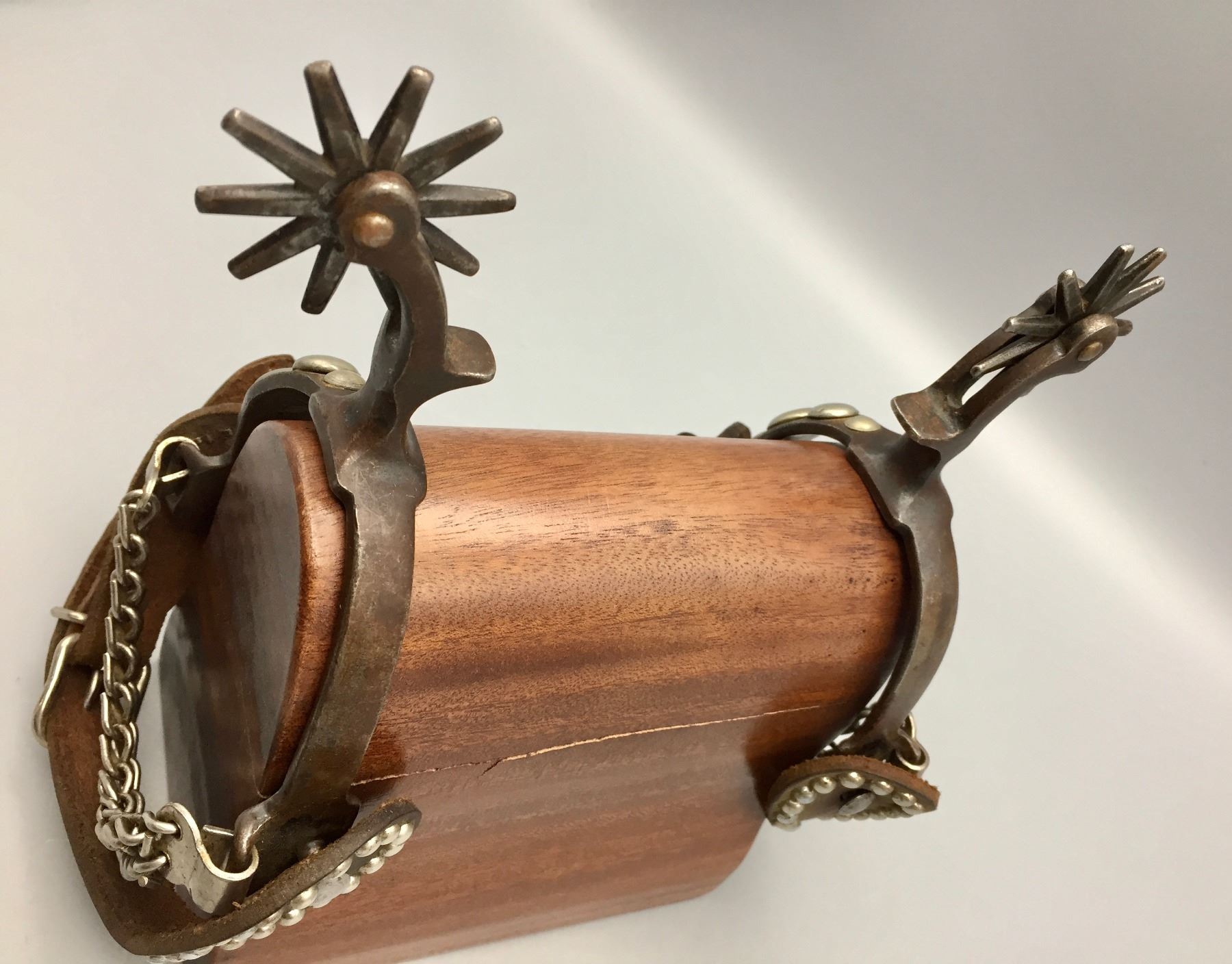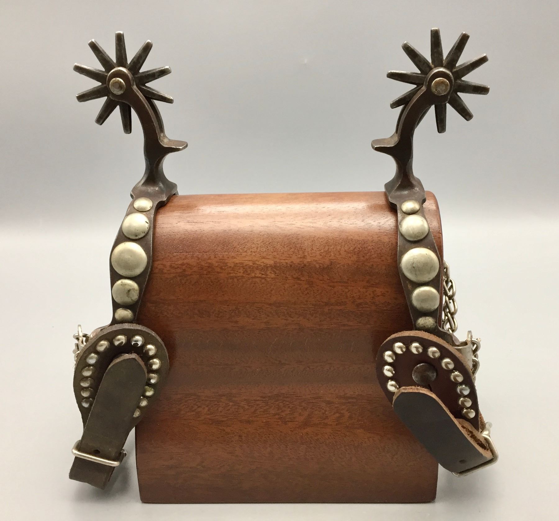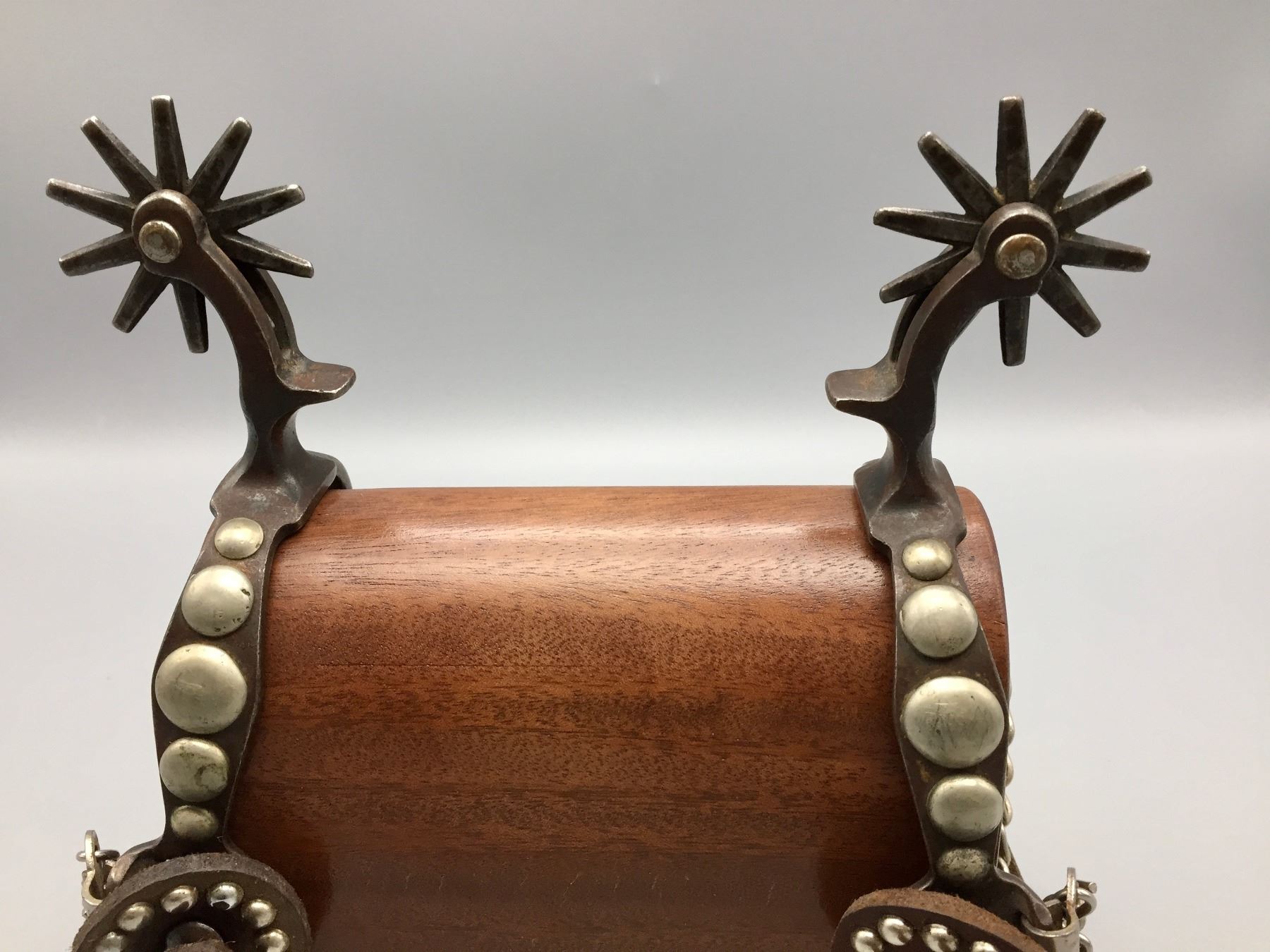 Description: Presented for sale in this lot is a pair of five spot Buermann style spurs with brown leather straps with silver button accents.