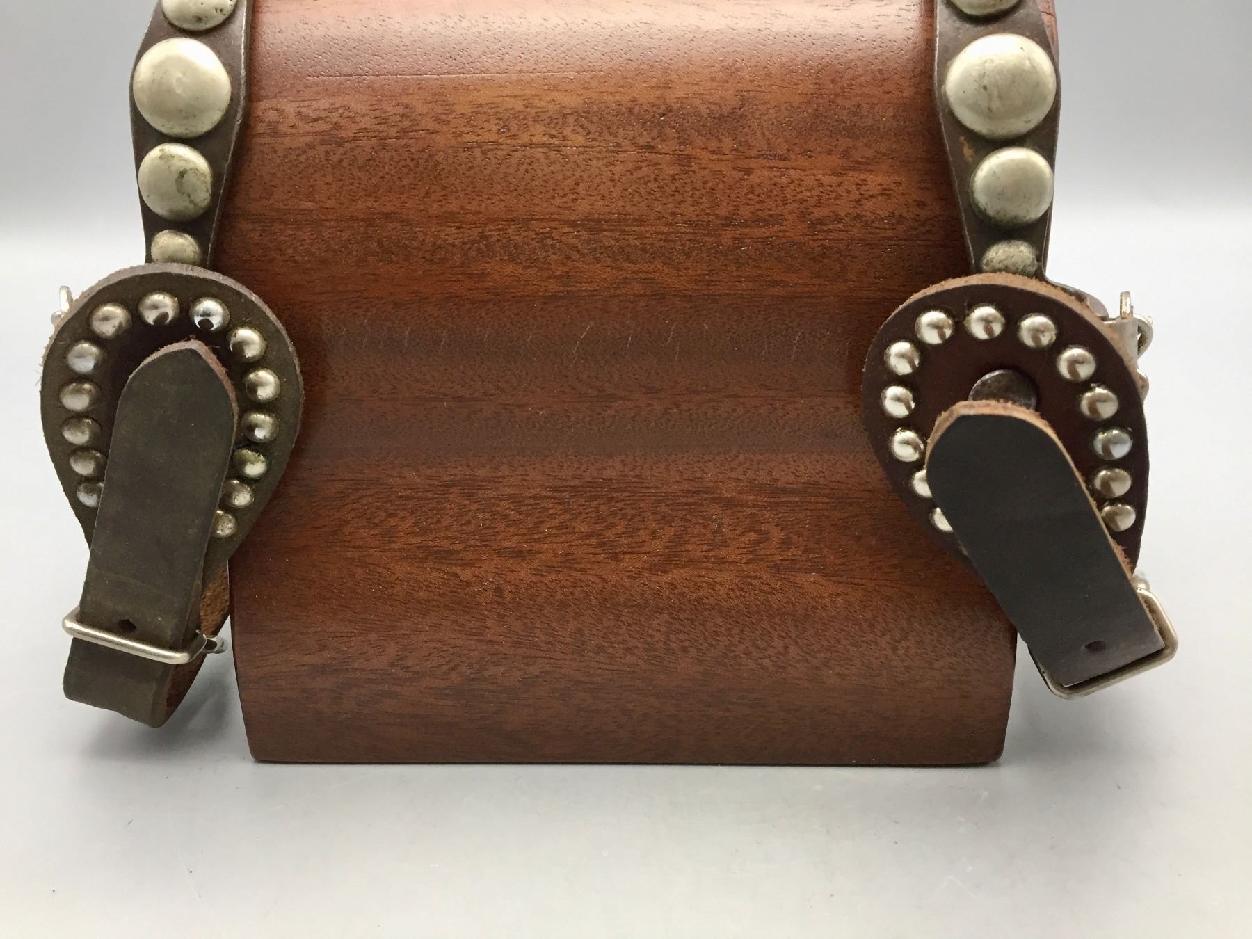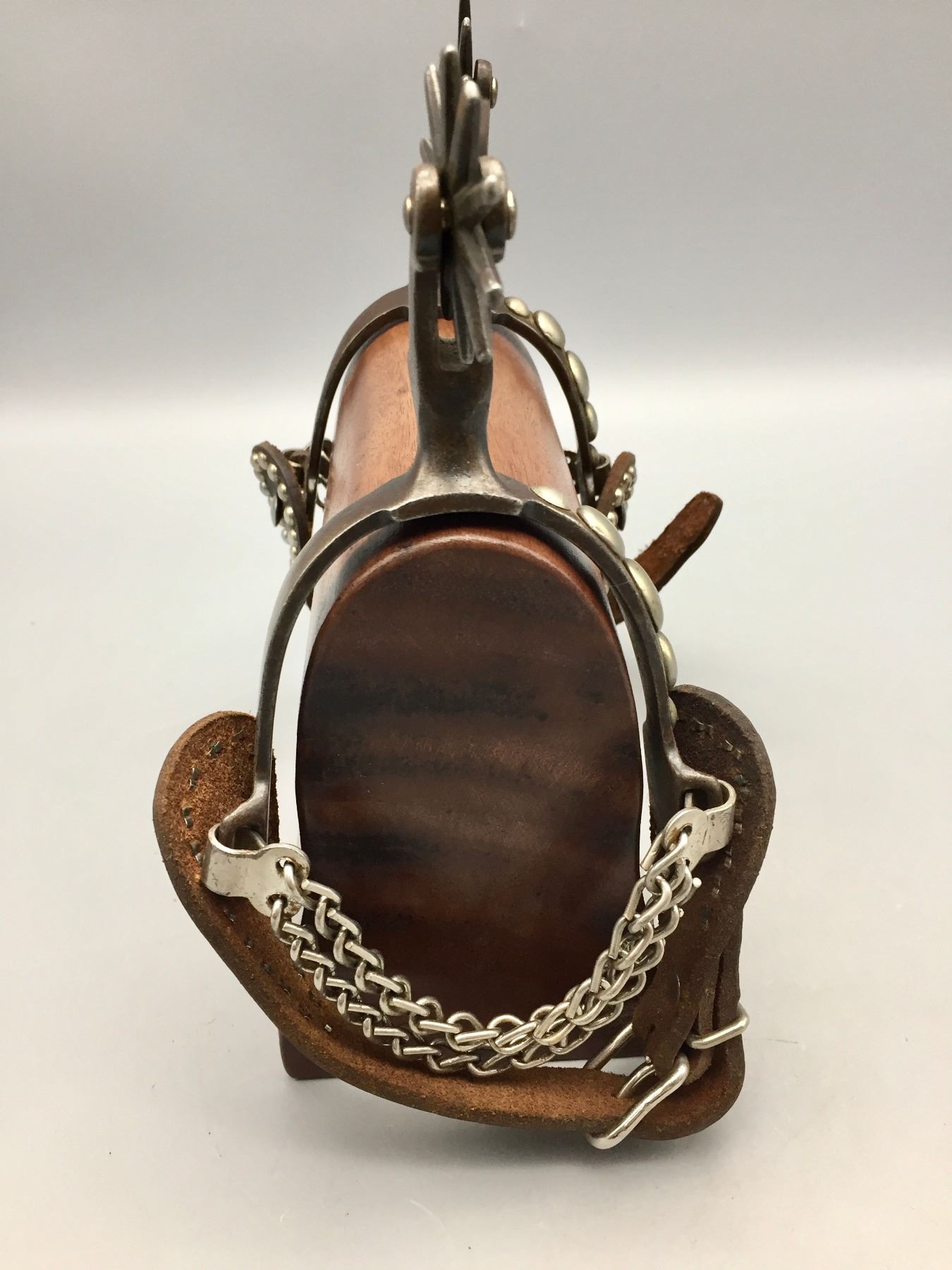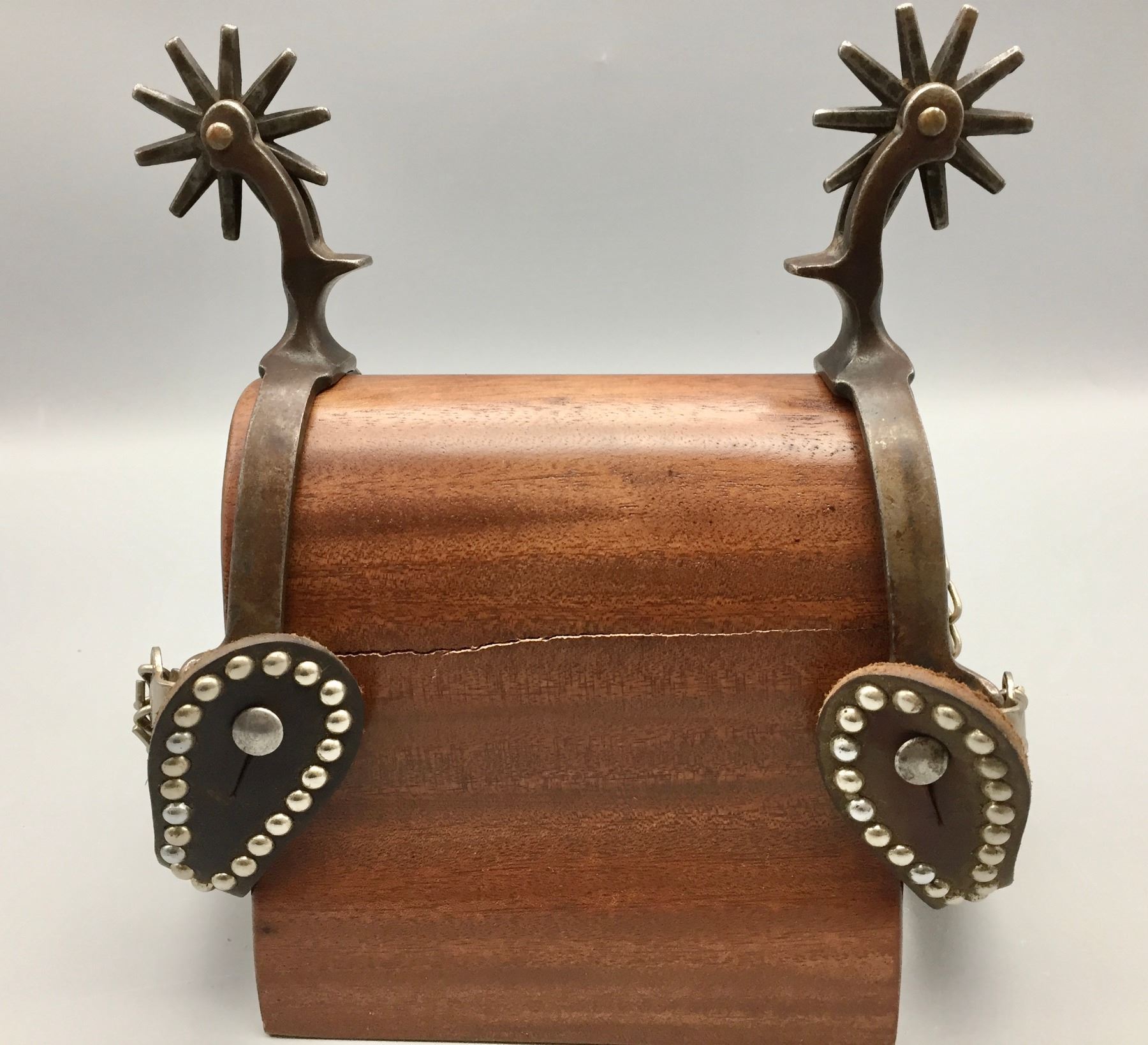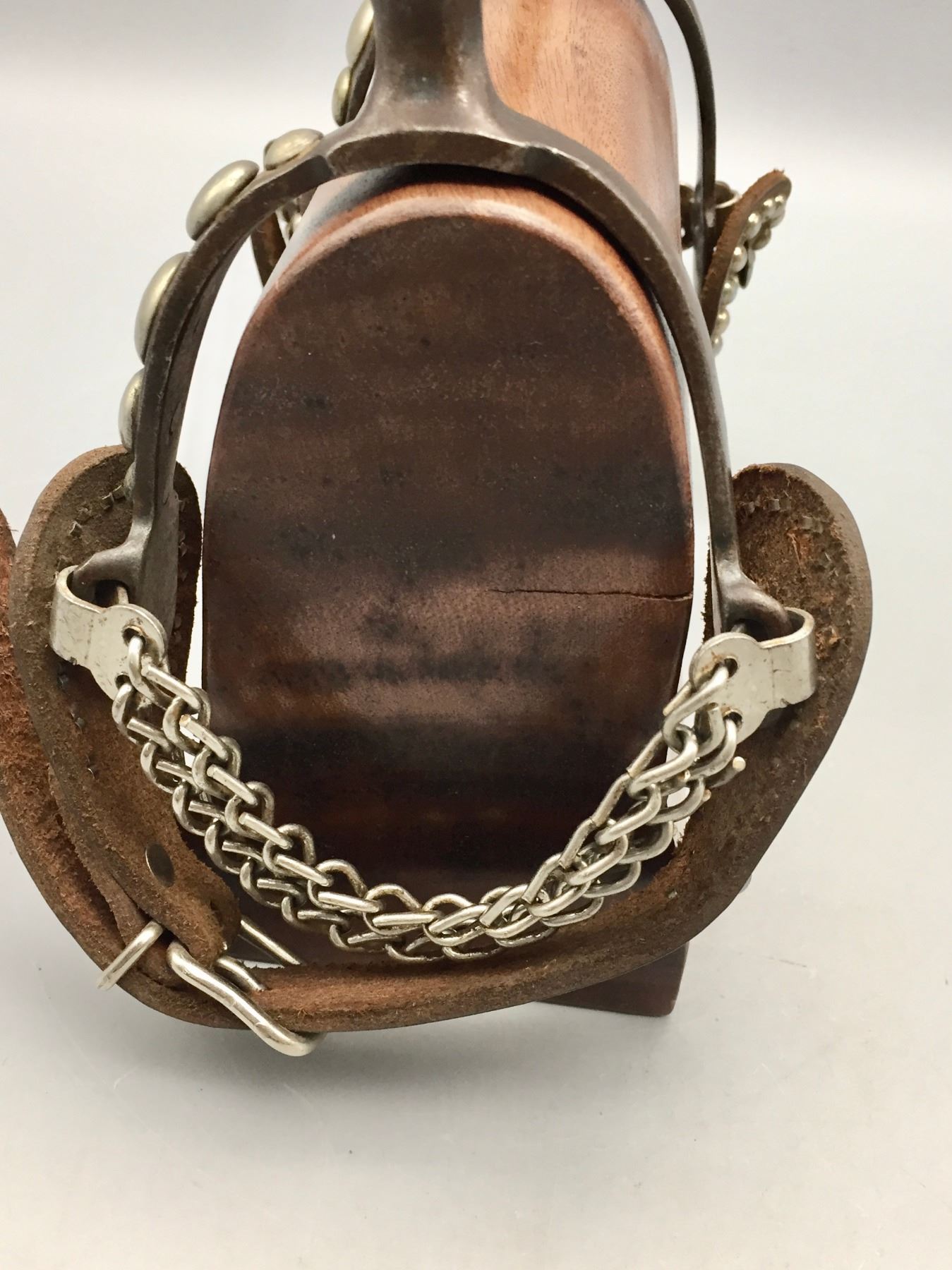 Description: Presented for sale in this lot is a pair of five spot Buermann style spurs with brown leather straps with silver button accents.