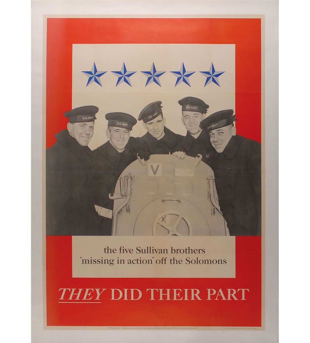 Original color 28 x 40 poster of the five Sullivan Brothers, issued in 1943 by the US Government Printing Office, OWI Poster #42. Poster features an image of the brothers with, “The five Sullivan brothers ‘missing in action’ off the Solomons. They did their part.” Poster has been professionally linen-backed to a slightly larger size. In fine condition, with previous intersecting storage folds. Rolled. It was the death of all five brothers during the war in the Pacific that inspired the film Saving Private Ryan. The tragedy was also responsible for the military regulation that only a certain number of family members can serve in combat at the same time.