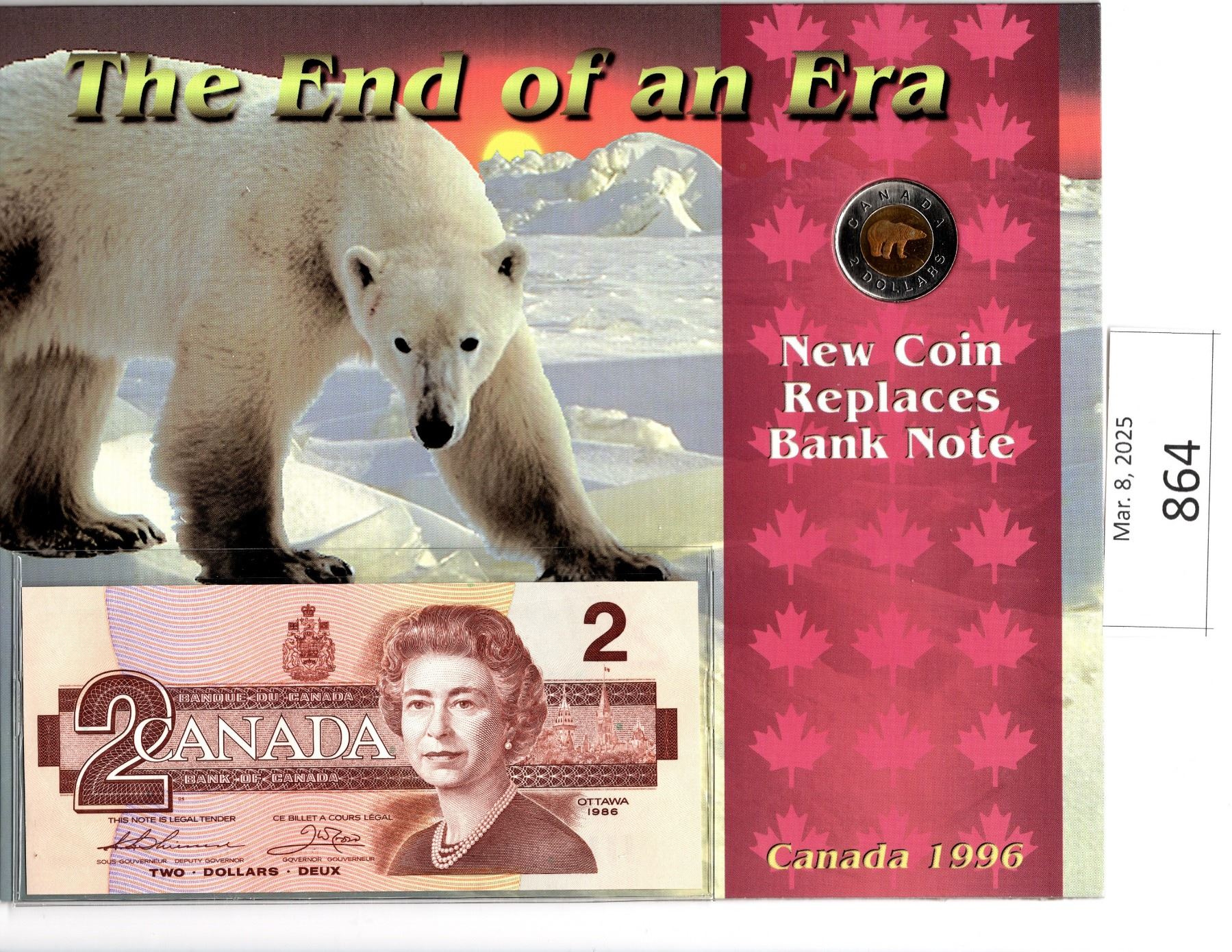 Five - "The End of an Era" Two Dollar Collector Cards with One Two Dollar Bill and One Toonie (Only one is pictured but there are 5)