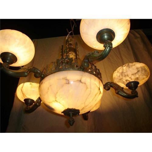 Five tulips, seven ligths, alabaster stone and casted bronze grand chandelier.It will be shipped in two crates, one with the alabaster component the other one with the bronze component. Some assembly will be required. The shipping cost within USA is $ 175.00. This iten is in working condition and was rewired to USA standards.