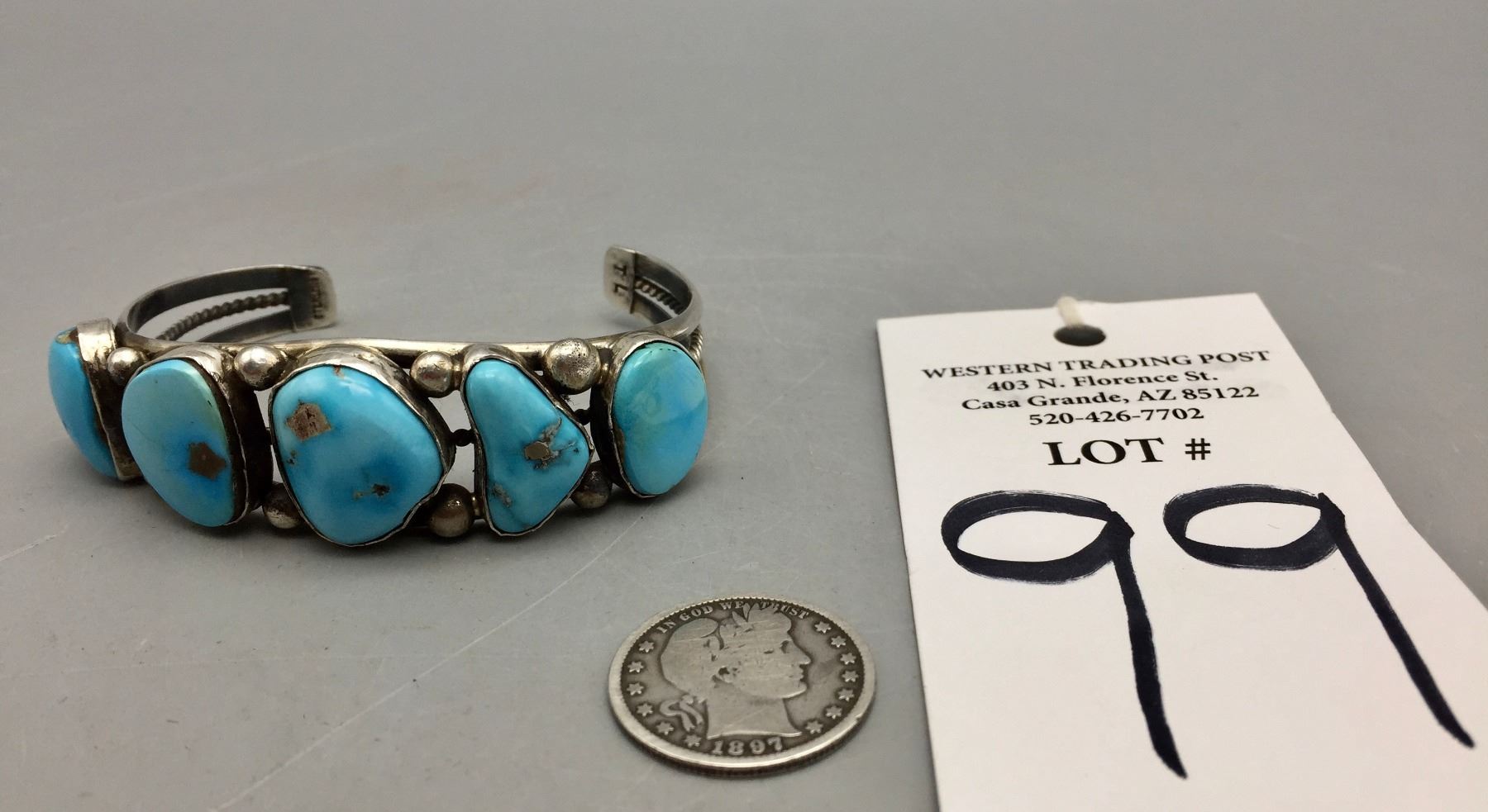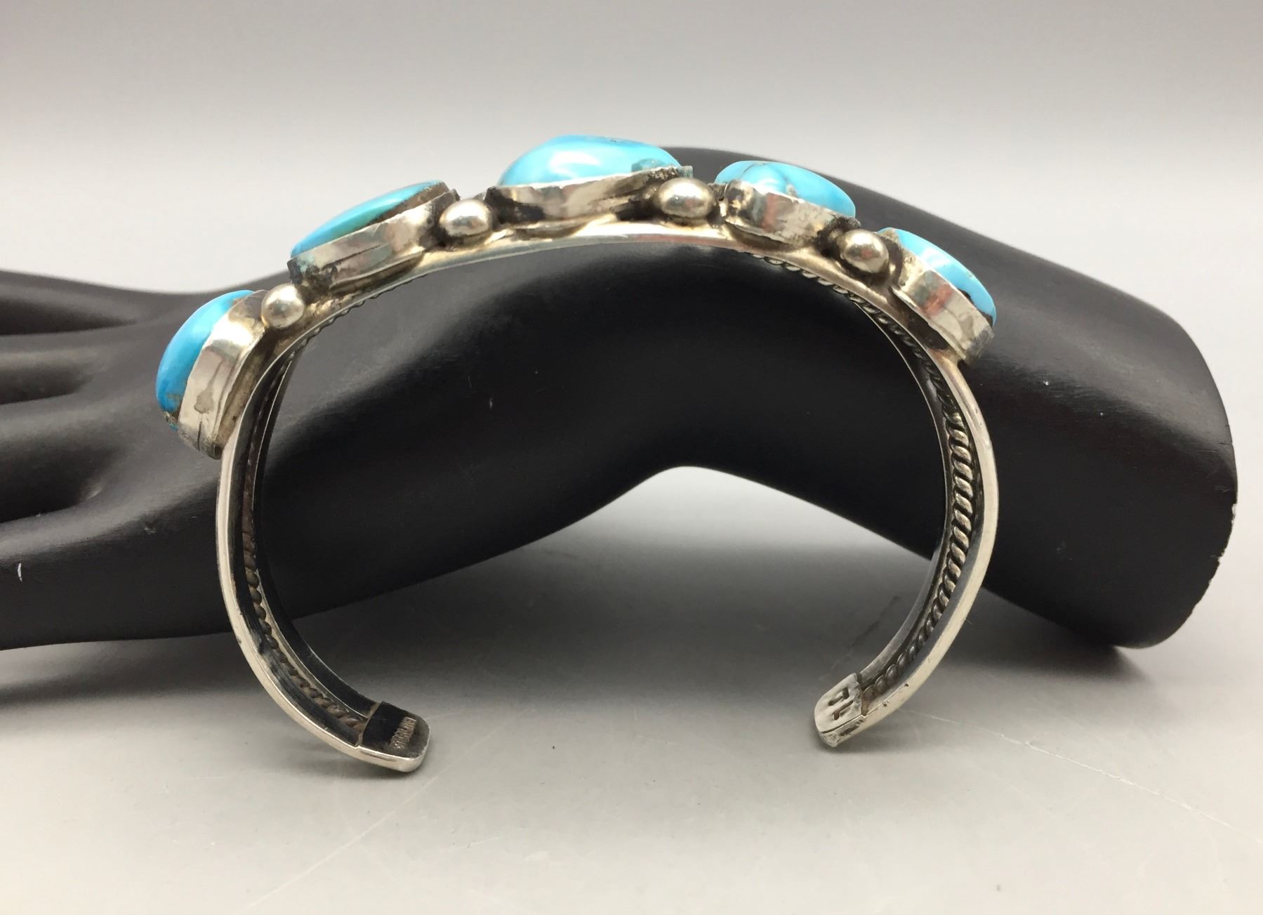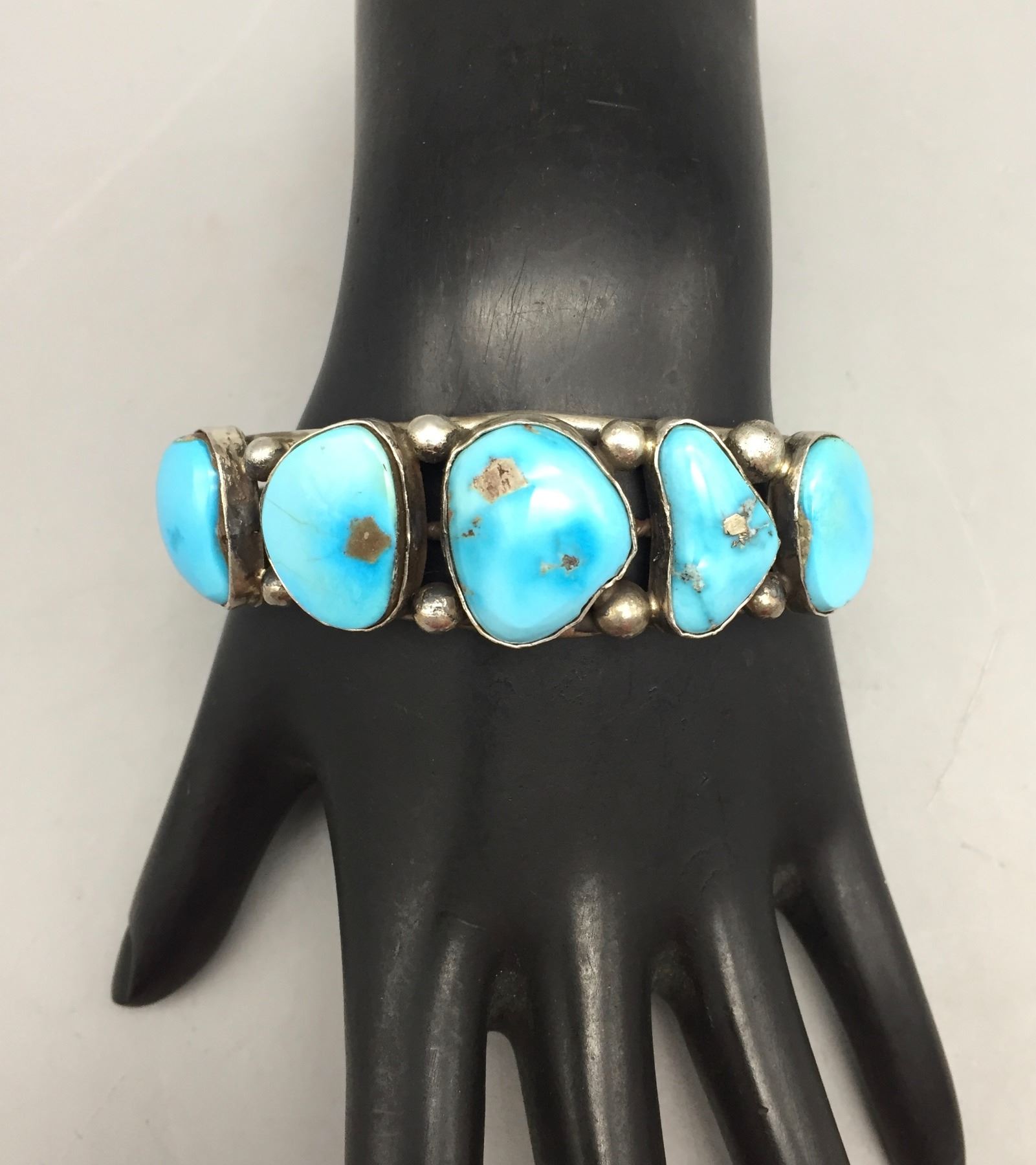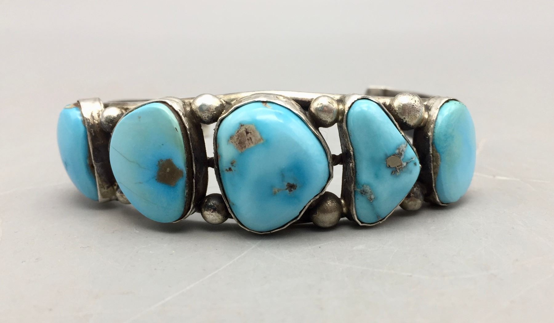 Description: Featured in this lot is a bracelet set with five bright blue turquoise stones. Tested as sterling silver.                                                                                                         Maker: Hallmarked TL for Thurman Lynch, Navajo.                                                                                                                  Approx. Age: Contemporary.                                                                                                            Size: Length 5 7/8”, Opening 1 1/2” (fits a 7 3/8” wrist). Width 7/8”. Weighs 39.6 grams.                                                                                                                                                                                                                               Condition: Good for its age, normal wear expected.                                                                                                                Please look closely at the pictures - they are an important part of our description.                                Shipping: There will be a $5 handling / packaging fee for shipping this lot. The actual cost of postage will be added on top of that.