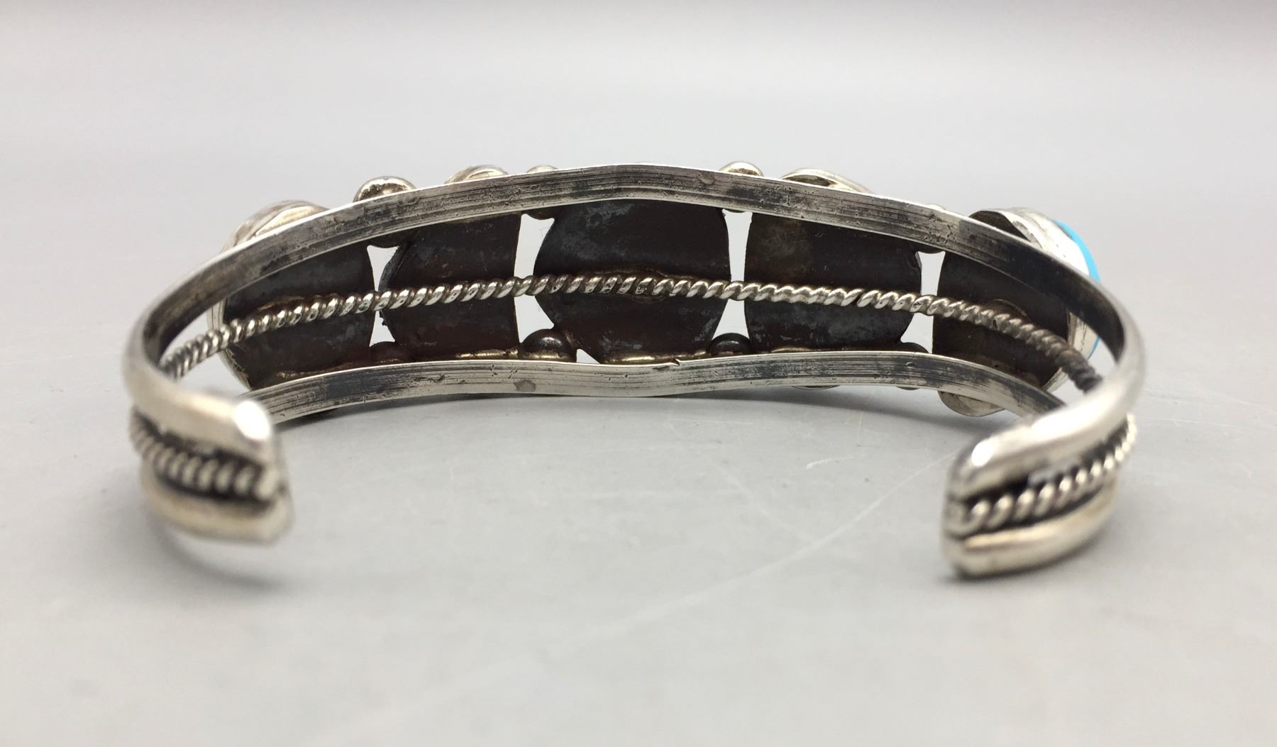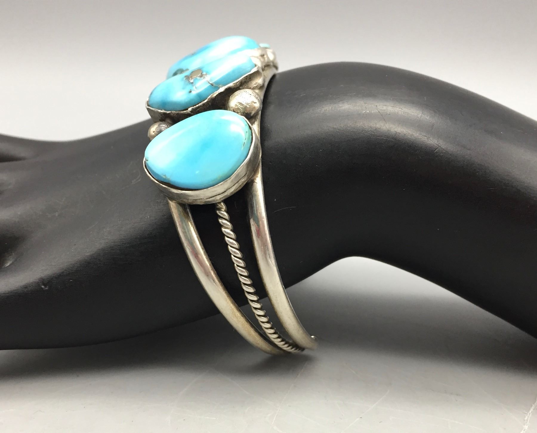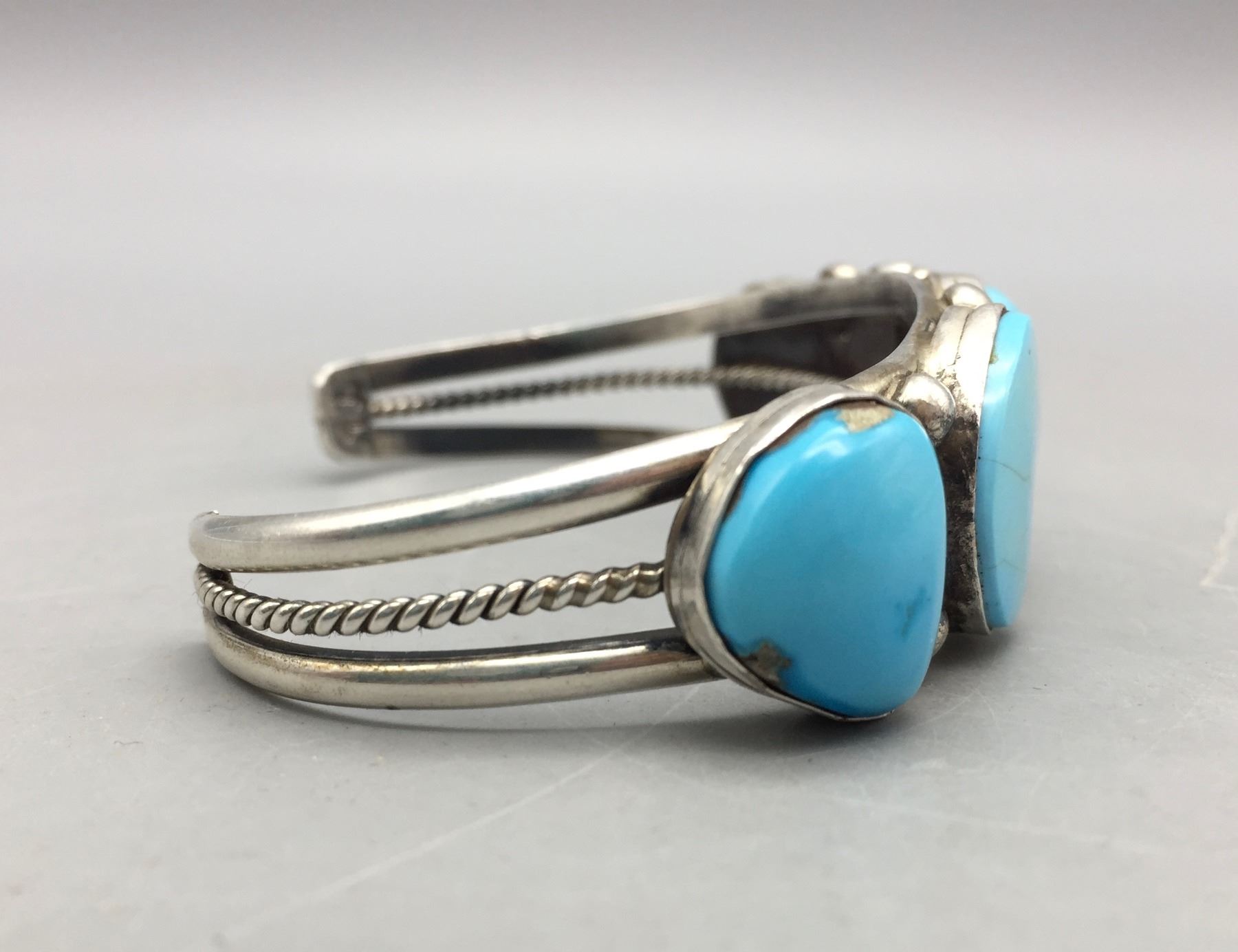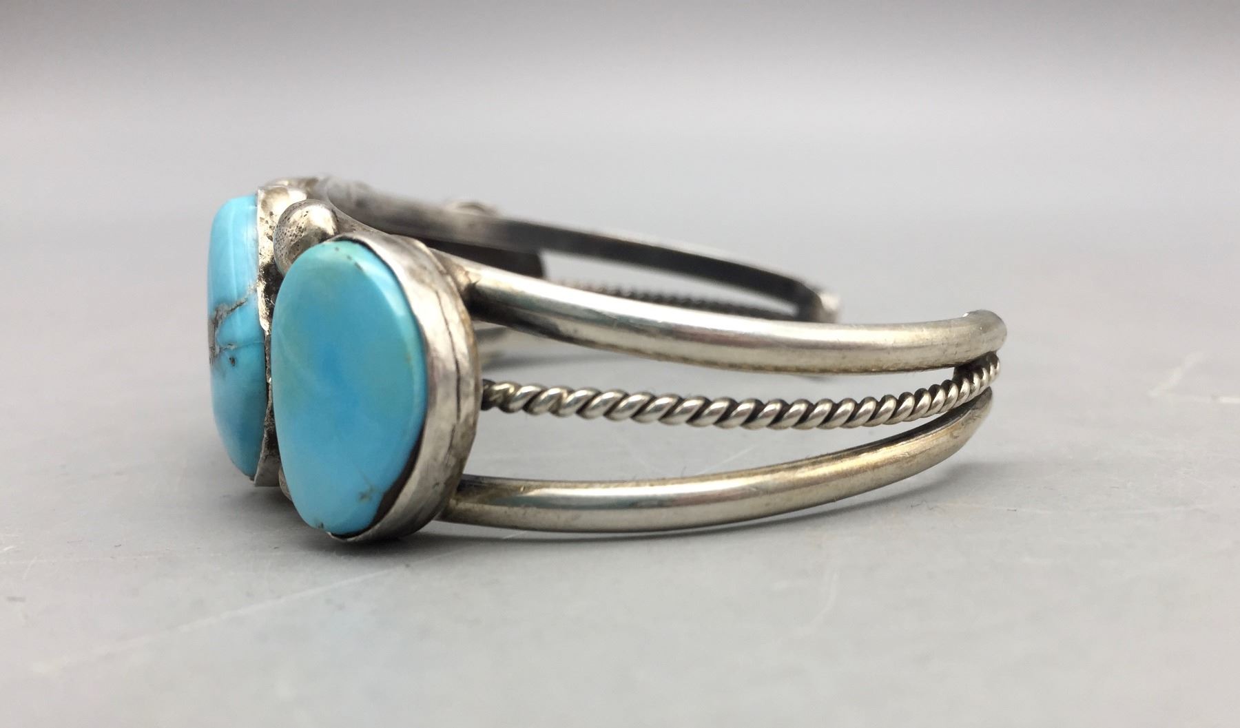 Description: Featured in this lot is a bracelet set with five bright blue turquoise stones. Tested as sterling silver.                                                                                                         Maker: Hallmarked TL for Thurman Lynch, Navajo.                                                                                                                  Approx. Age: Contemporary.                                                                                                            Size: Length 5 7/8”, Opening 1 1/2” (fits a 7 3/8” wrist). Width 7/8”. Weighs 39.6 grams.                                                                                                                                                                                                                               Condition: Good for its age, normal wear expected.                                                                                                                Please look closely at the pictures - they are an important part of our description.                                Shipping: There will be a $5 handling / packaging fee for shipping this lot. The actual cost of postage will be added on top of that.