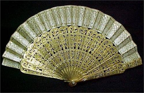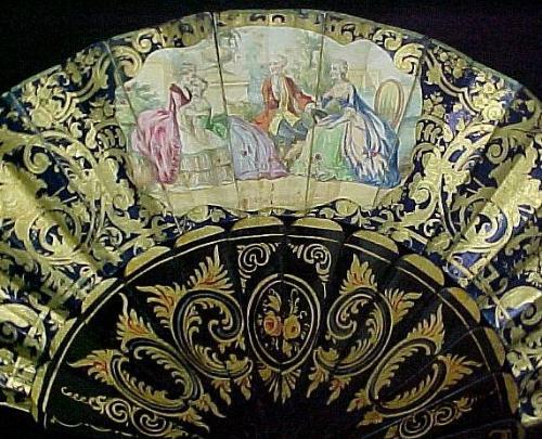 Five Victorian Fans include J. E. Caldwell faux tortoise with matching box; monogrammed with applied gold or gold filled initials; 8 1/4" long; missing ribbon, some loss to box; mourning fan 13 3/4" long; intricately carved black wood with satin backed lace; slight wear; black lacquer fan with gold decoration and courting scene; 10 3/4" long; slight wear; small celluloid 6" long with black mesh, sequins and mother of pearl; slight damage to mother of pearl; and gold painted carved wood 8 1/2" long with cream colored silk, gold thread and sequins; slight loss