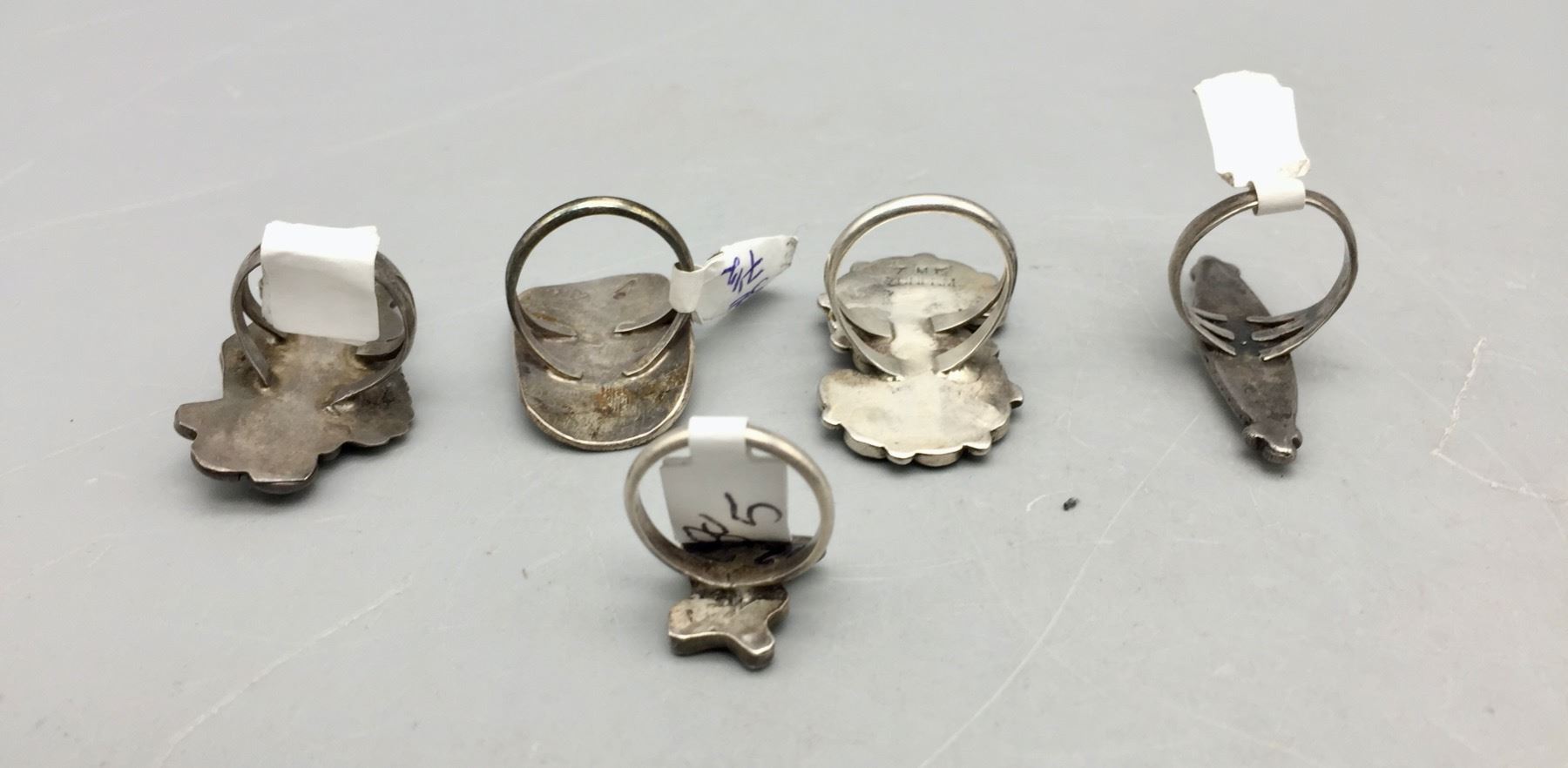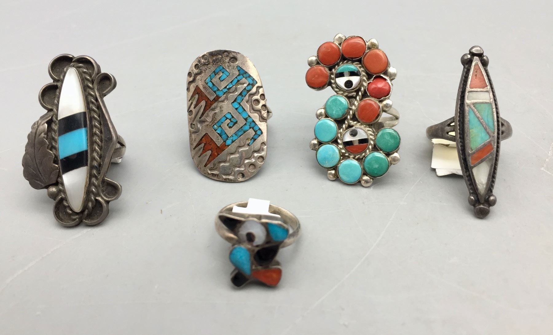 Description: For sale in this lot is is a group of five vintage inlay rings. All have various styles and shapes, set with various stones in sterling silver. Maker: Various. Approx. Age: Vintage. Size: Various. Weighs 33.5 grams. Condition: Good for their age, normal wear expected. Please look closely at the pictures - they are an important part of our description. Shipping: There will be a $5 handling / packaging fee for shipping this lot. The actual cost of postage will be added on top of that.