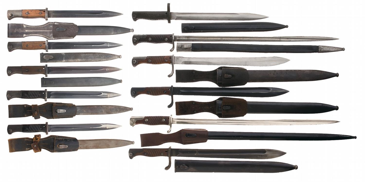 1) "44 cvl" and "1733 / n" on ricassos, smooth grips, sheath with "cgn / 43" marked leather frog. 2) "43 fnj" marking, smooth grips, numbered to sheath. 3) "S/177K" marked ricasso, "W.u.K. / A.S.1042." marked sheath, smooth grips. 4) Eickhorn, grooved grips, numbered to sheath with leather frog. 5) W.K.C. grooved grips, numbered to sheath, leather frog. 6) Bayonet, 12 1/2" single fuller blade with faint proofs, green painted metal grip and black painted sheath. 7) Simson & Co. bayonet, 20 3/4" single fuller blade, marked "W/06" on the spine, with ribbed grips and leather and metal sheath. 8) J. Corts (Remscheid) bayonet, originally an engineer's model, 14 1/2" single fuller blade with milled down spine and "16" on the spine. Ribbed grips and metal sheath with leather frog. 9) Mundloss/ Deutsche Maschinefabrik bayonet, 14 3/8" single fuller blade, "17" on the spine, ribbed wood grip, metal sheath and leather frog. 10) Bayonet, 21" single fuller blade with helm logo on the ricasso, single quillion guard, ribbed grip and metal sheath with frog. 11) Mauser bayonet, 14 3/8" single fuller blade, "RLM." marked cross guard, ribbed wood grip and metal sheath.
