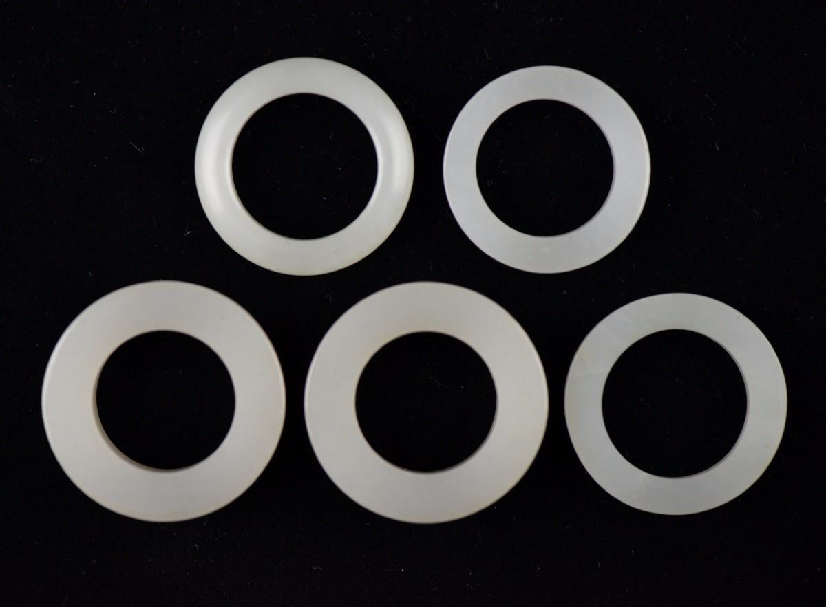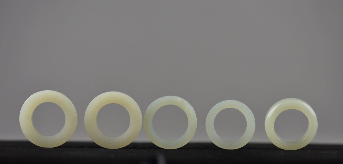 Five White Hetian Jade Archer's Rings assorted sizes.D: 4 cm, D: 2 cm (interior diameter), 52 grams (total)