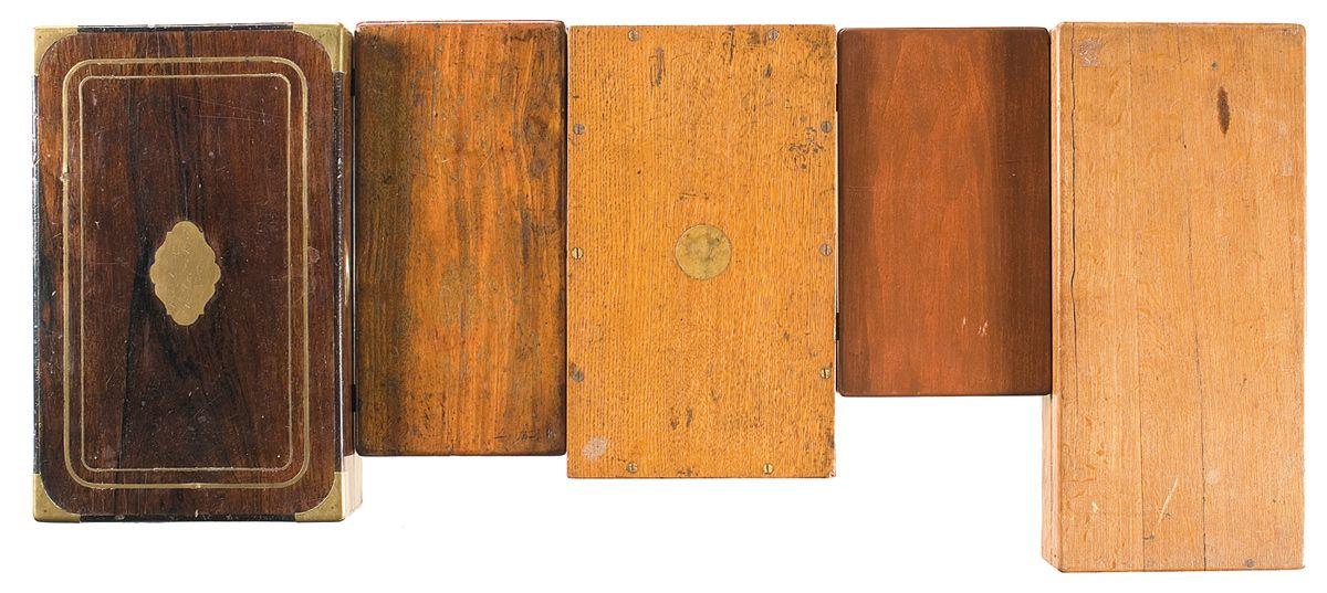 1) 8 1/4 X 13 1/4 x 3 inch hardwood case with a blue velvet lining, lid is inlayed with brass and has brass fittings, Has an initial plate marked "Robert Conway/ Luatow. China/ 1867". Six fitted compartments for a Belgian revolver and accessories. 2) 5 3/4 X 11 3/4 X 2 inch hardwood case with a blue velvet lining, five compartments. 3) 7 1/8 X 12 X 2 1/2 inch case with an initial circle, blue felt lining, six main compartments and a 25 round ammo block. 4) 5 3/4 X 10 X 2 inch hardwood case with a green velvet lining, divided into five compartments. 5) 7 5/8 X 14 1/2 X 2 1/2 inch hardwood case with green felt lining divided into 5 compartments. All items are good to very fine.