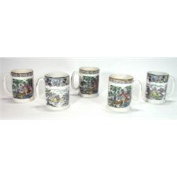 Five Woods tankards hand coloured and transfer printed with 'English Scenery', marks to base, 13cm high